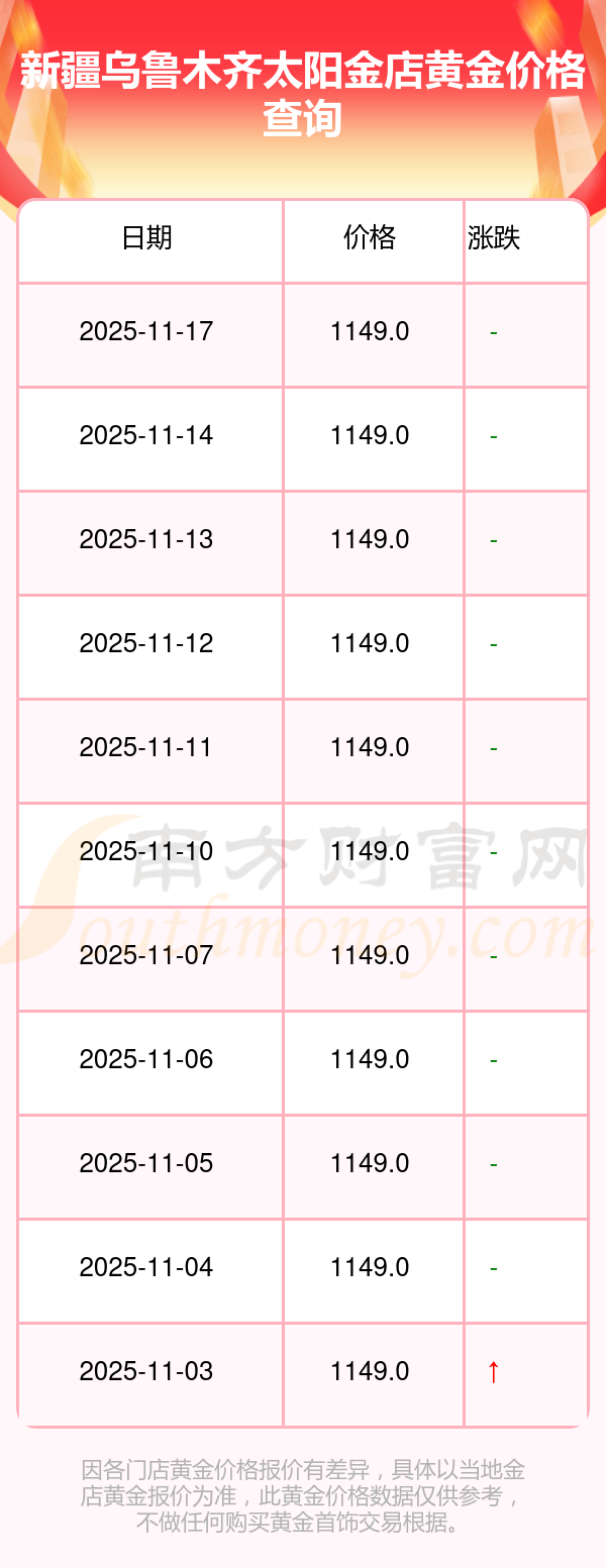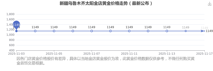 2025年11月17日新疆乌鲁木齐太阳金店黄金价格是1149.0元/克。