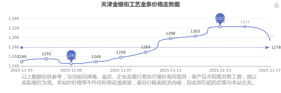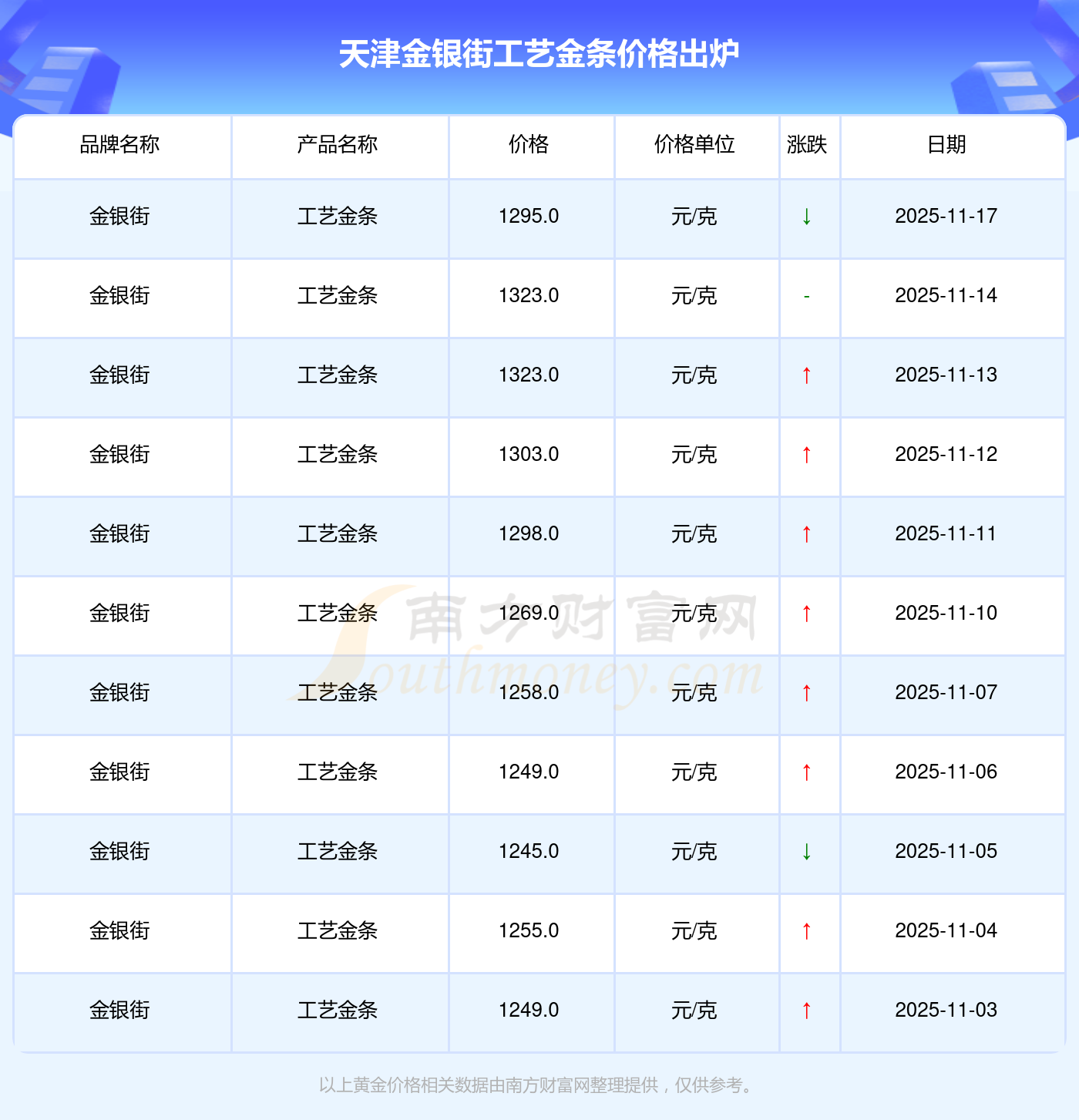今日(2025年11月17日),1295.0元/克是天津金银街工艺金条的价格标准。