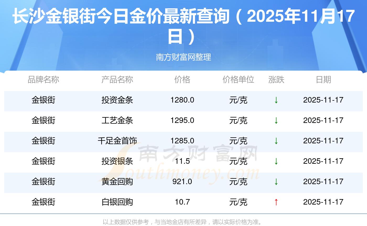 今日黄金价格查询_现在金价黄金一克多少钱,黄金价格是多少钱一克?2025年11月17日长沙金银街金价查询:金饰价格(内地)1305.0元/克,黄金饰品(香港)46270.0,铂金饰品(香港)13490.0,金条金价(香港)41990.0,投资金条1280.0元/克,工艺金条1295.0元/克,千足金首饰1285.0元/克,投资银条11.5元/克,黄金回购921.0元/克,白银回购10.7元/克,千足金饰品1256.0元/克。