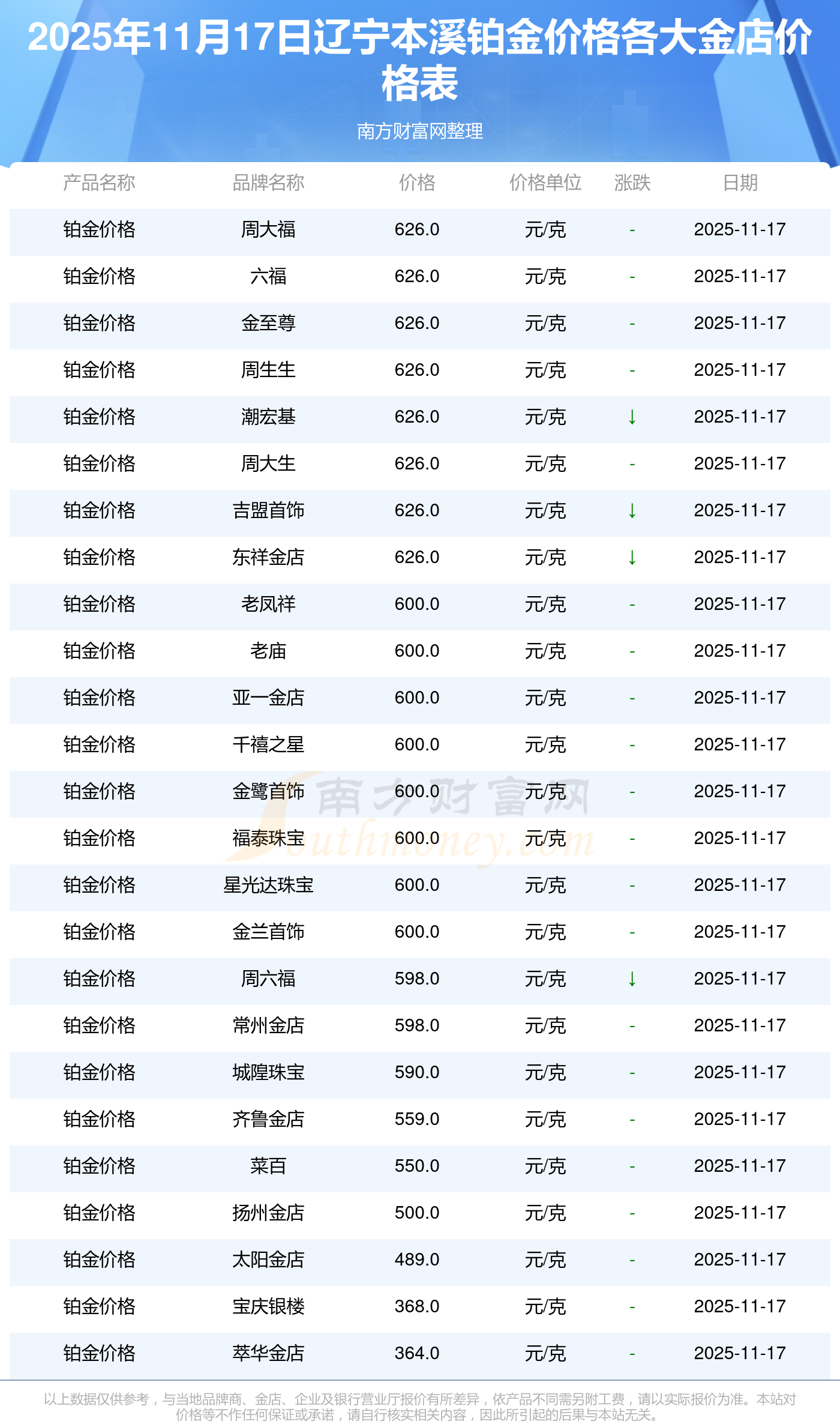 2025年11月17日,辽宁本溪谢瑞麟、谢瑞麟、谢瑞麟、谢瑞麟、金银街、金银街、金银街、金银街、金银街、金银街、多边金都珠宝等各大金店品牌铂金价格今日价格如下:谢瑞麟1305.0元/克、谢瑞麟46270.0、谢瑞麟13490.0、谢瑞麟41990.0、金银街1280.0元/克、金银街1295.0元/克、金银街1285.0元/克、金银街11.5元/克、金银街921.0元/克、金银街10.7元/克、多边金都珠宝1256.0元/克。