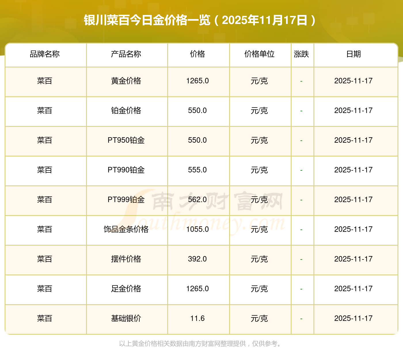 以上数据仅供参考,与当地品牌商、金店、企业及银行营业厅报价有所差异,依产品不同需另附工费,请以实际报价为准。本站对价格等不作任何保证或承诺,请自行核实相关内容,因此所引起的后果与本站无关。