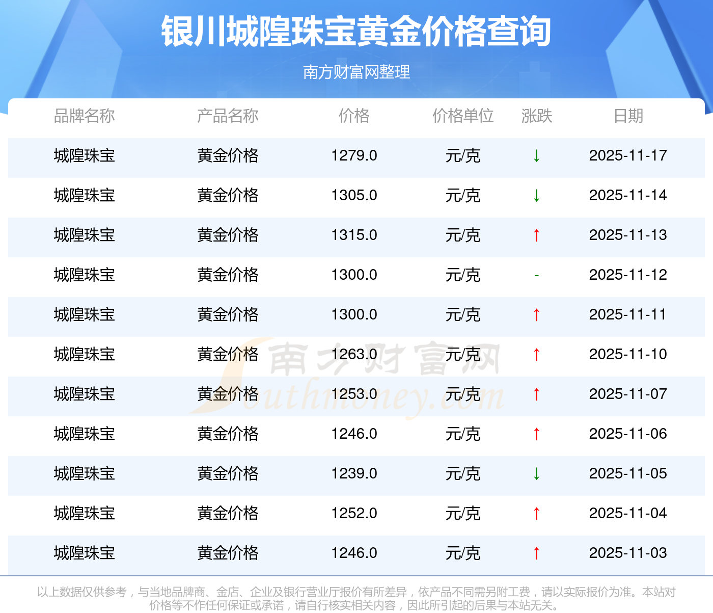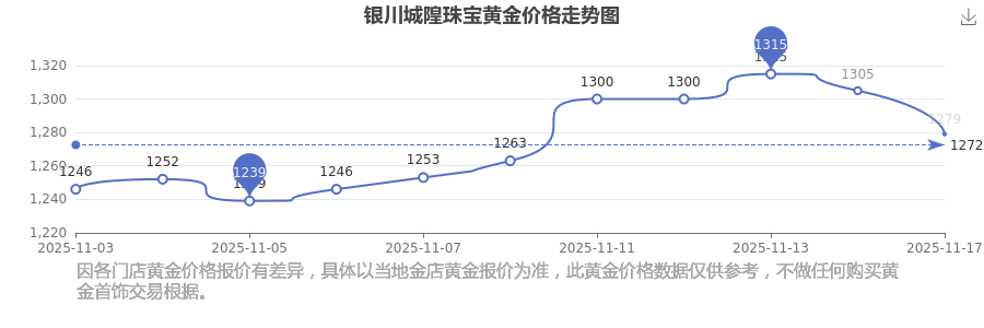 银川城隍珠宝现在黄金价格每克多少?现在买一克黄金得花多少钱?今日银川城隍珠宝黄金价格查询,今日(2025年11月17日),银川城隍珠宝黄金价格:1279.0元/克。