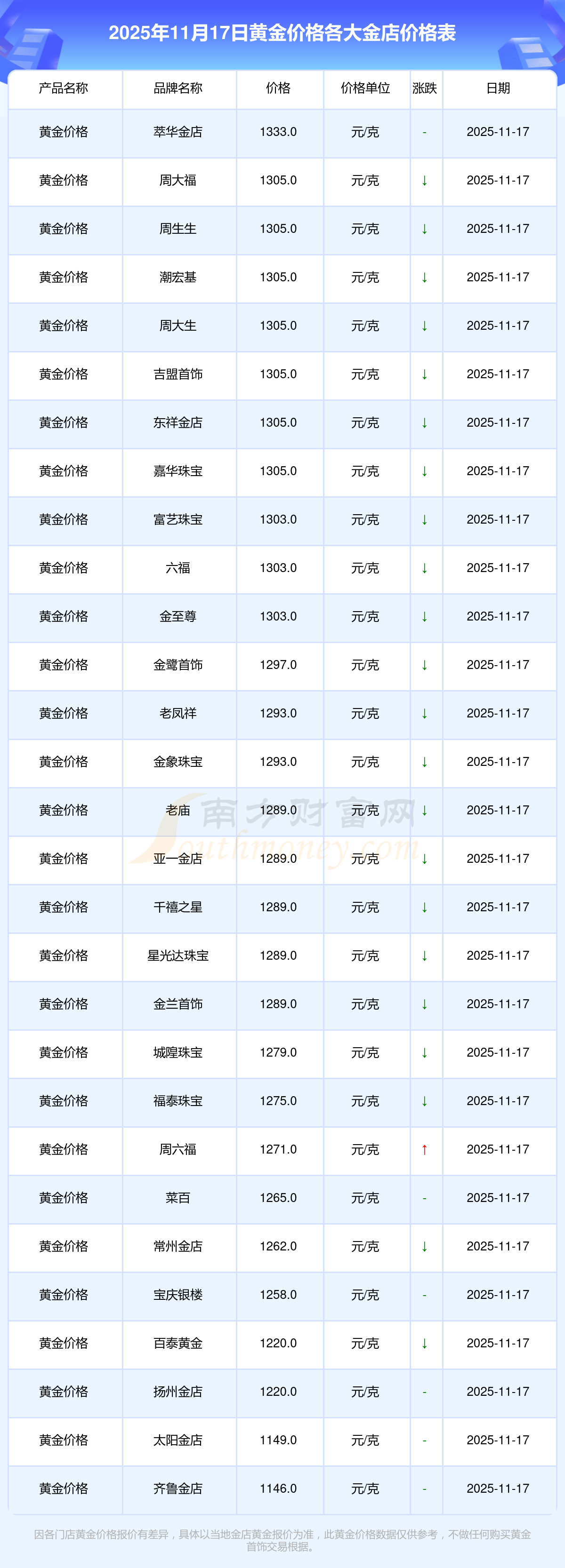 2025年11月17日各大金店黄金价格最新价格:谢瑞麟1305.0元/克,谢瑞麟46270.0,谢瑞麟13490.0,谢瑞麟41990.0,金银街1280.0元/克,金银街1295.0元/克,金银街1285.0元/克,金银街11.5元/克,金银街921.0元/克,金银街10.7元/克,多边金都珠宝1256.0元/克。