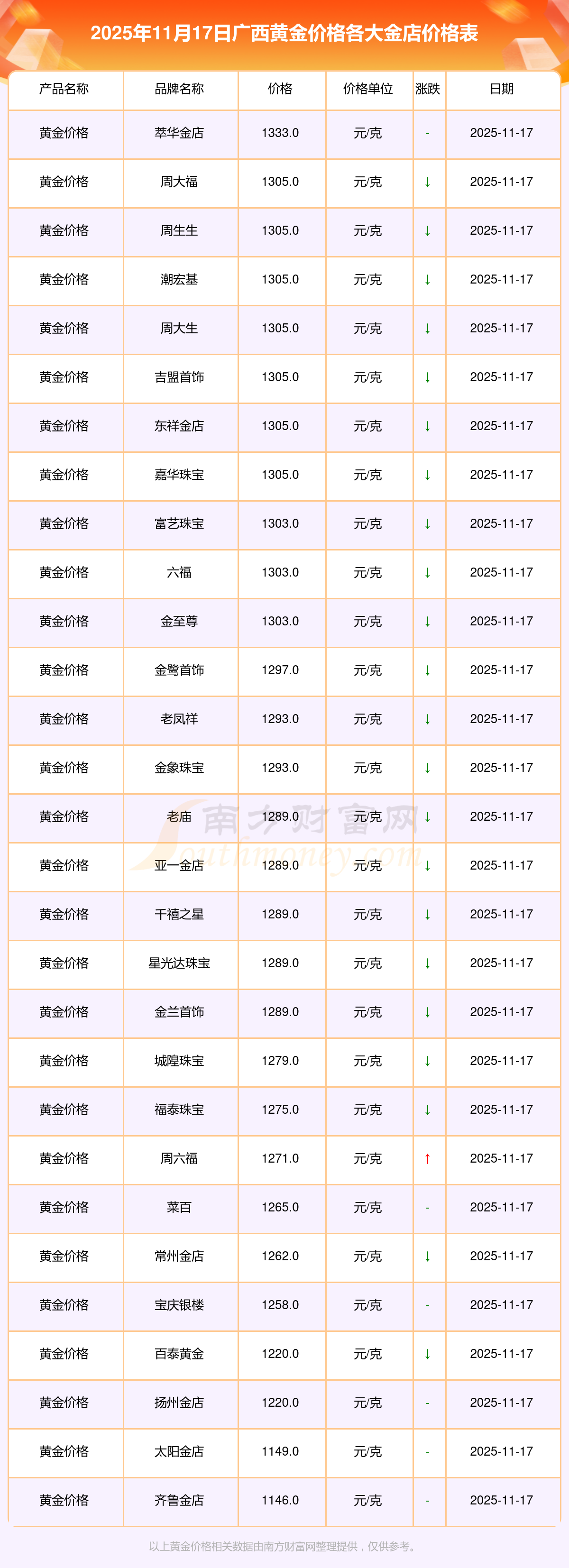 2025年11月17日广西各大金店黄金价格最新价格:谢瑞麟1305.0元/克,谢瑞麟46270.0,谢瑞麟13490.0,谢瑞麟41990.0,金银街1280.0元/克,金银街1295.0元/克,金银街1285.0元/克,金银街11.5元/克,金银街921.0元/克,金银街10.7元/克,多边金都珠宝1256.0元/克。