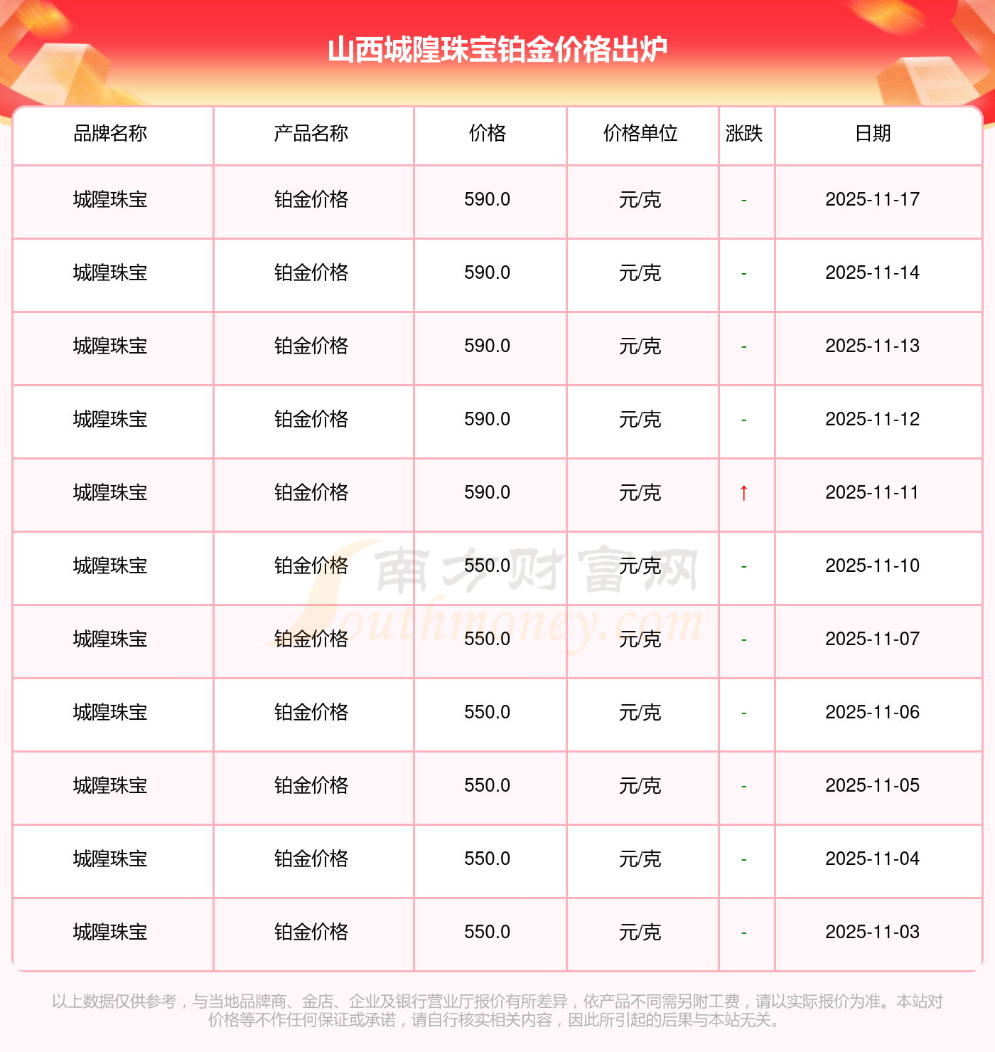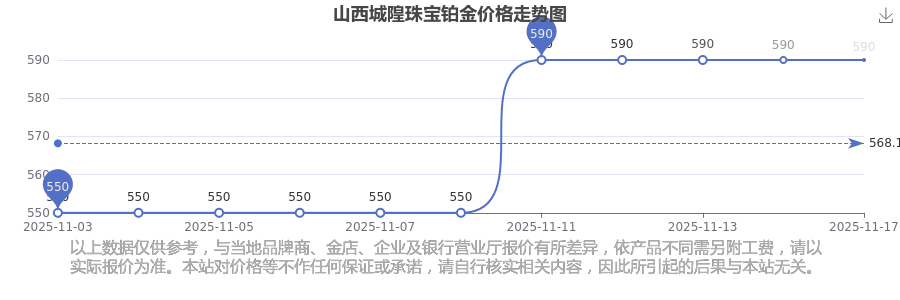 590.0元/克,此乃山西城隍珠宝于 2025年11月17日铂金价格的挂牌价格。