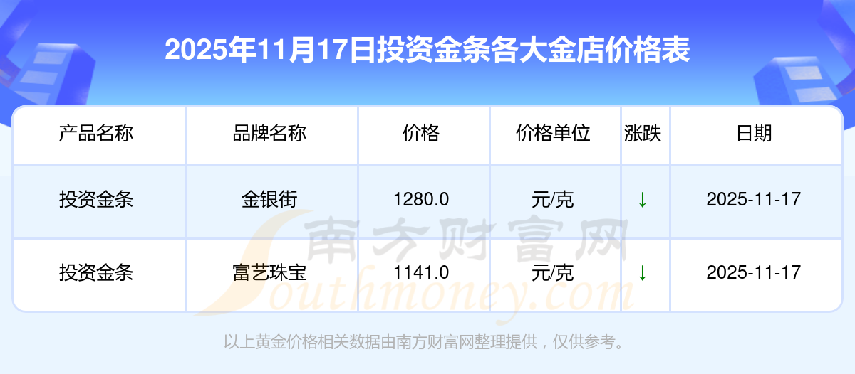 2025年11月17日谢瑞麟、谢瑞麟、谢瑞麟、谢瑞麟、金银街、金银街、金银街、金银街、金银街、金银街、多边金都珠宝等各大金店品牌投资金条最新价格如下:谢瑞麟金饰价格(内地)1305.0元/克,谢瑞麟黄金饰品(香港)46270.0,谢瑞麟铂金饰品(香港)13490.0,谢瑞麟金条金价(香港)41990.0,金银街投资金条1280.0元/克,金银街工艺金条1295.0元/克,金银街千足金首饰1285.0元/克,金银街投资银条11.5元/克,金银街黄金回购921.0元/克,金银街白银回购10.7元/克,多边金都珠宝千足金饰品1256.0元/克。