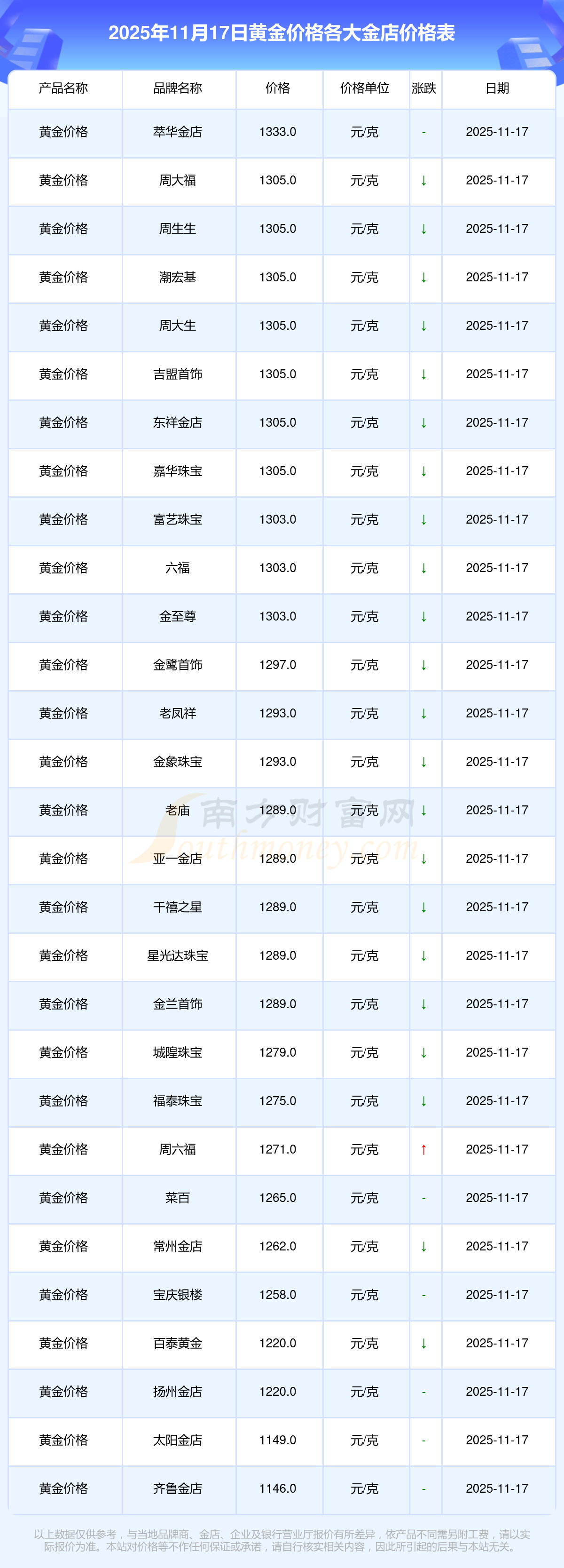 2025年11月17日谢瑞麟、谢瑞麟、谢瑞麟、谢瑞麟、金银街、金银街、金银街、金银街、金银街、金银街、多边金都珠宝等各大金店品牌黄金价格最新价格如下:谢瑞麟金饰价格(内地)1305.0元/克,谢瑞麟黄金饰品(香港)46270.0,谢瑞麟铂金饰品(香港)13490.0,谢瑞麟金条金价(香港)41990.0,金银街投资金条1280.0元/克,金银街工艺金条1295.0元/克,金银街千足金首饰1285.0元/克,金银街投资银条11.5元/克,金银街黄金回购921.0元/克,金银街白银回购10.7元/克,多边金都珠宝千足金饰品1256.0元/克。