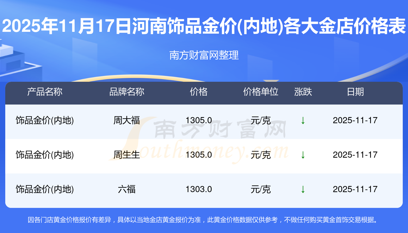 2025年11月17日今日河南各金店饰品金价(内地)多少钱一克?