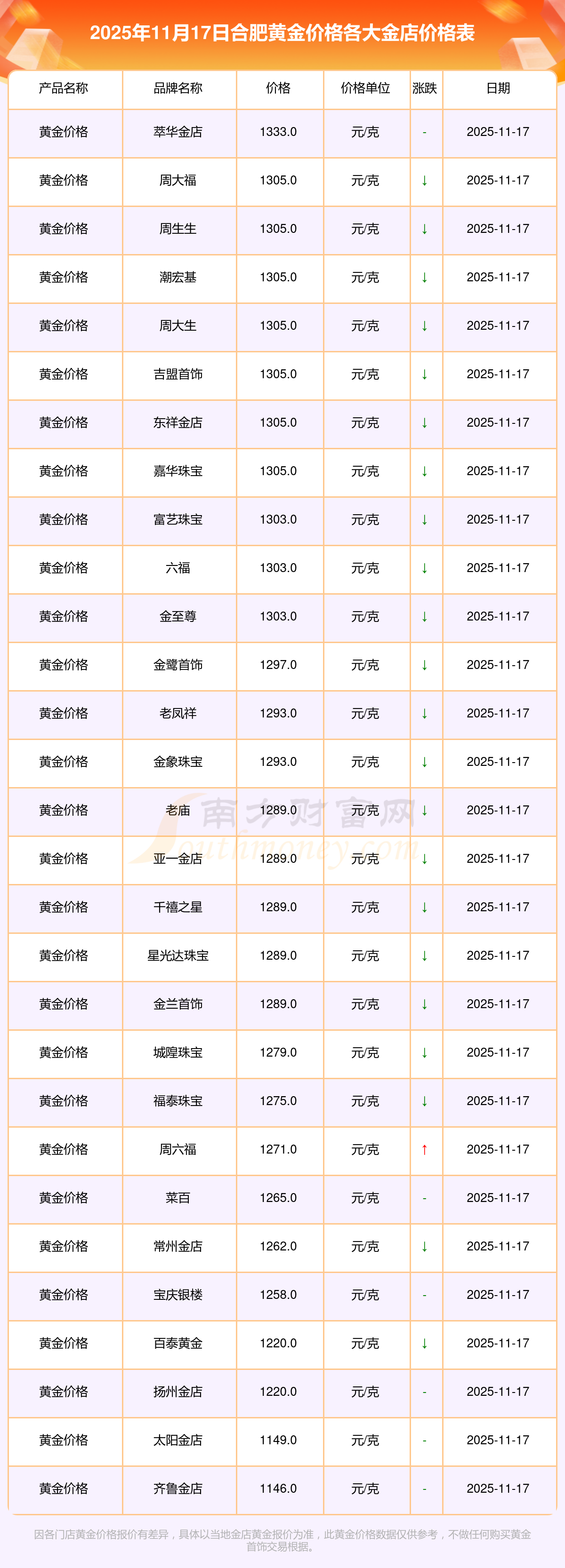 2025年11月17日合肥各大金店黄金价格最新价格:谢瑞麟1305.0元/克,谢瑞麟46270.0,谢瑞麟13490.0,谢瑞麟41990.0,金银街1280.0元/克,金银街1295.0元/克,金银街1285.0元/克,金银街11.5元/克,金银街921.0元/克,金银街10.7元/克,多边金都珠宝1256.0元/克。