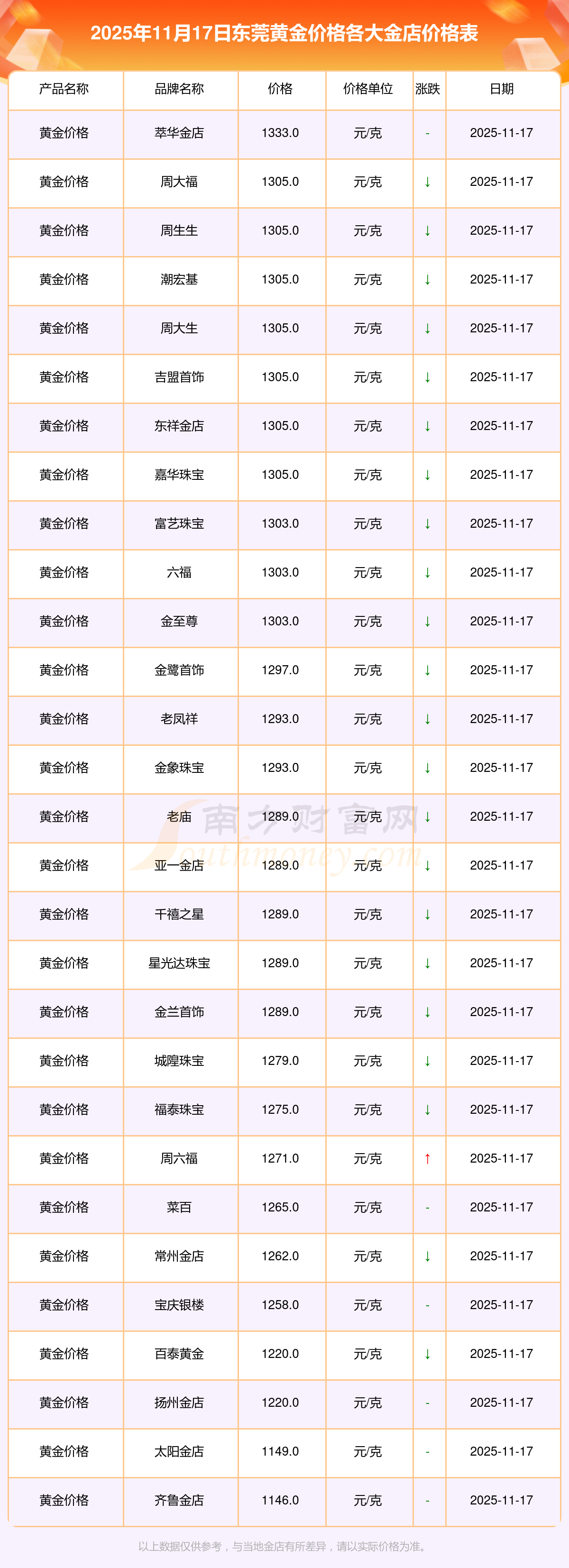 2025年11月17日东莞各大金店黄金价格最新价格查询来了:谢瑞麟1305.0元/克,谢瑞麟46270.0,谢瑞麟13490.0,谢瑞麟41990.0,金银街1280.0元/克,金银街1295.0元/克,金银街1285.0元/克,金银街11.5元/克,金银街921.0元/克,金银街10.7元/克,多边金都珠宝1256.0元/克。