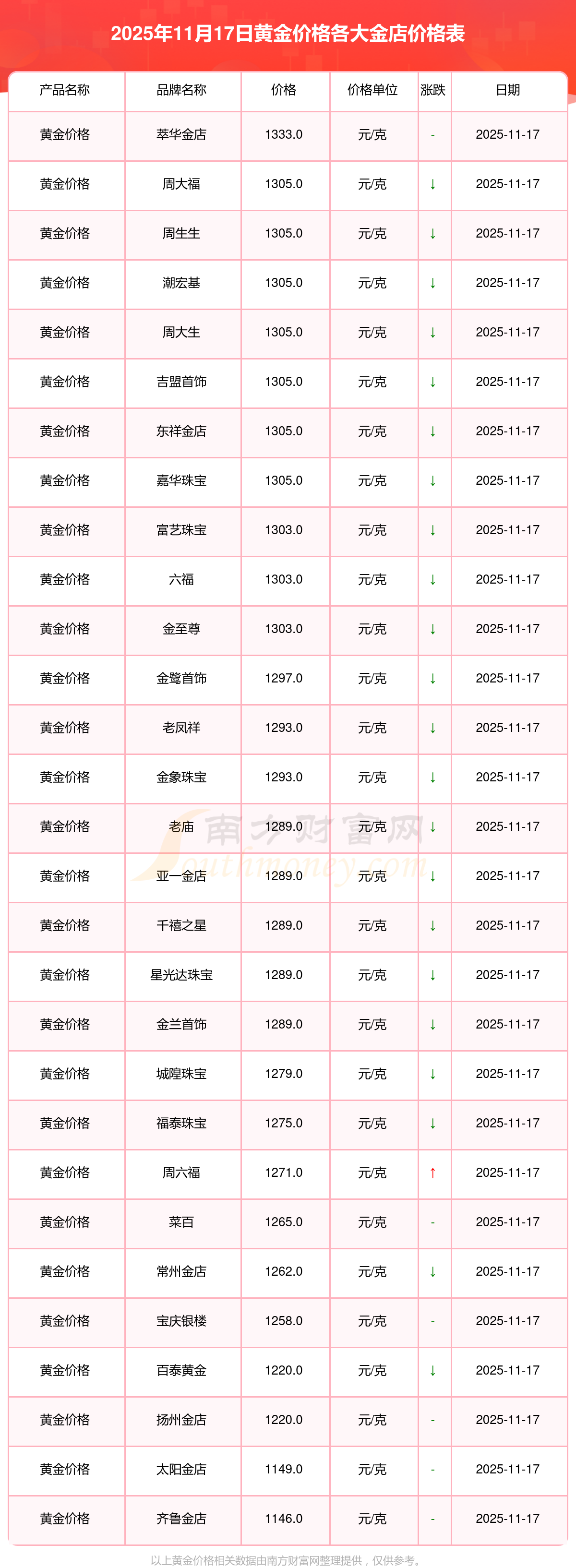 2025年11月17日各大金店黄金价格最新价格:谢瑞麟1305.0元/克,谢瑞麟46270.0,谢瑞麟13490.0,谢瑞麟41990.0,金银街1280.0元/克,金银街1295.0元/克,金银街1285.0元/克,金银街11.5元/克,金银街921.0元/克,金银街10.7元/克,多边金都珠宝1256.0元/克。