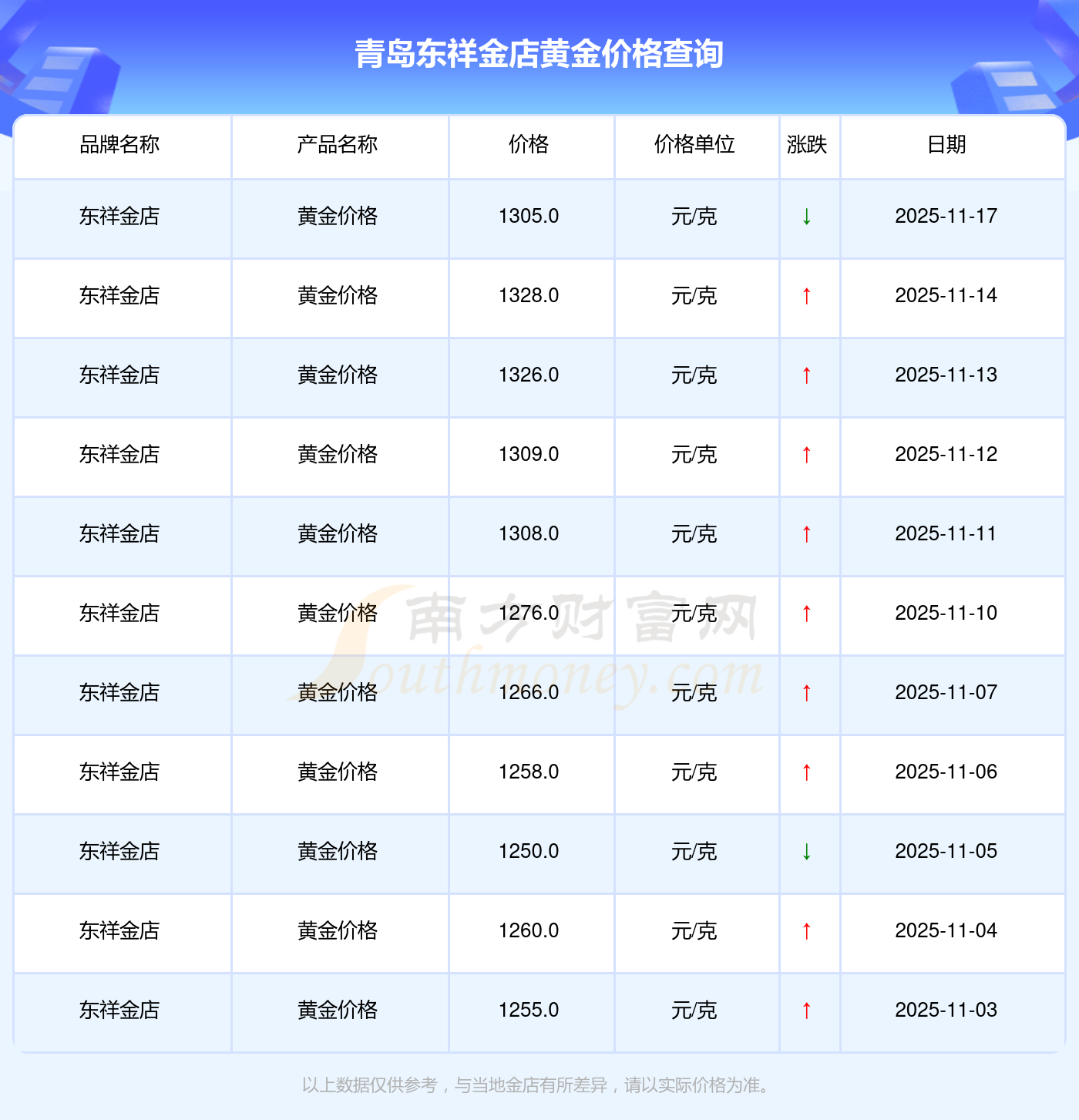 2025年11月17日青岛东祥金店黄金价格是1305.0元/克。