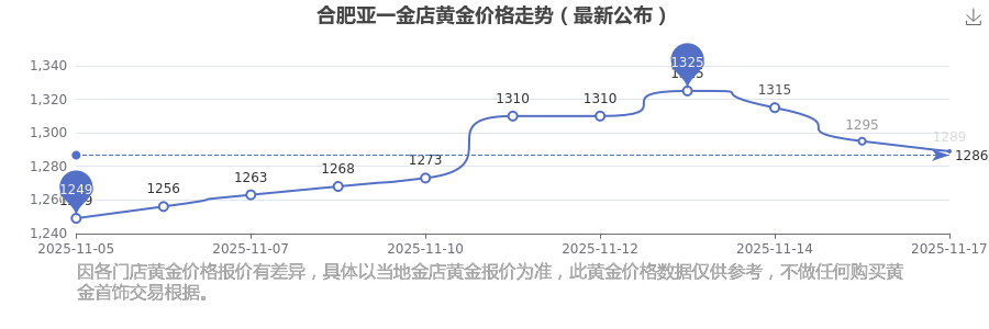 合肥亚一金店的黄金价格在今日(2025年11月17日),每克售价为1289.0元/克。