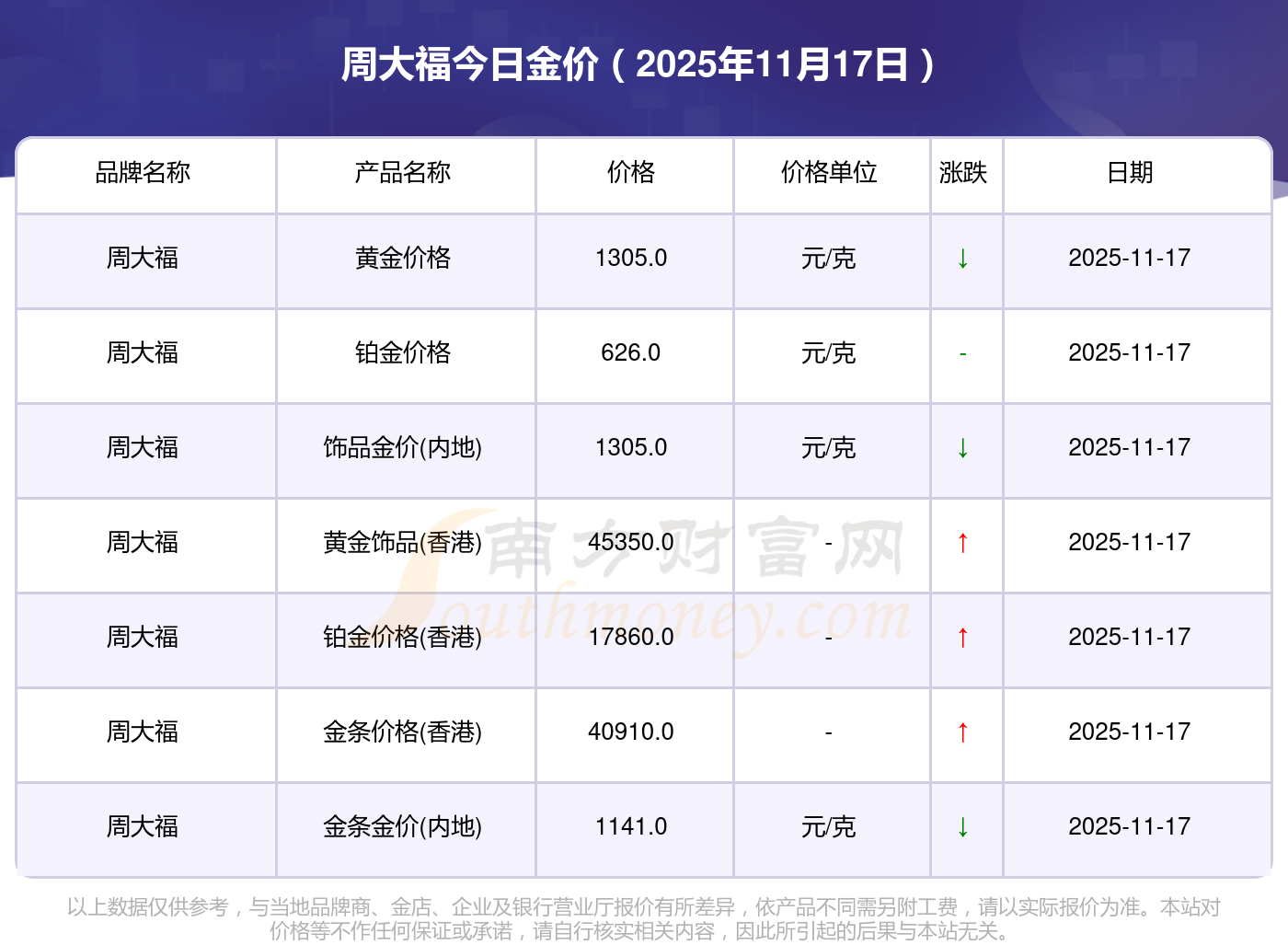今天是2025年11月17日,谢瑞麟、谢瑞麟、谢瑞麟、谢瑞麟、金银街、金银街、金银街、金银街、金银街、金银街、多边金都珠宝等各大金店品牌黄金价格最新价格如下:谢瑞麟1305.0元/克、谢瑞麟46270.0、谢瑞麟13490.0、谢瑞麟41990.0、金银街1280.0元/克、金银街1295.0元/克、金银街1285.0元/克、金银街11.5元/克、金银街921.0元/克、金银街10.7元/克、多边金都珠宝1256.0元/克。