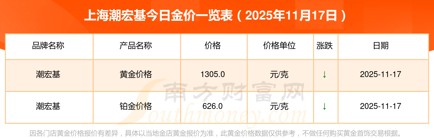 上海潮宏基金价今日价格:金饰价格(内地)1305.0元/克,黄金饰品(香港)46270.0,铂金饰品(香港)13490.0,金条金价(香港)41990.0,投资金条1280.0元/克,工艺金条1295.0元/克,千足金首饰1285.0元/克,投资银条11.5元/克,黄金回购921.0元/克,白银回购10.7元/克,千足金饰品1256.0元/克。