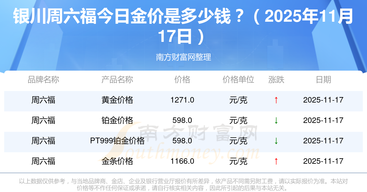 2025年11月17日银川周六福每克黄金的市场价格是多少:金饰价格(内地)1305.0元/克,黄金饰品(香港)46270.0,铂金饰品(香港)13490.0,金条金价(香港)41990.0,投资金条1280.0元/克,工艺金条1295.0元/克,千足金首饰1285.0元/克,投资银条11.5元/克,黄金回购921.0元/克,白银回购10.7元/克,千足金饰品1256.0元/克。