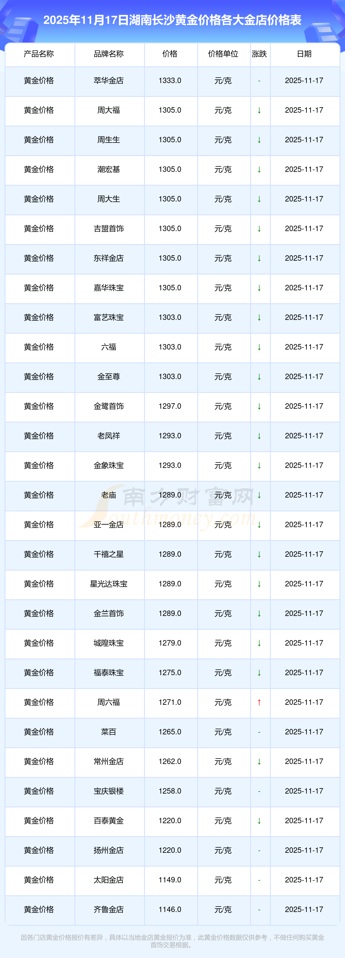 2025年11月17日,湖南长沙谢瑞麟、谢瑞麟、谢瑞麟、谢瑞麟、金银街、金银街、金银街、金银街、金银街、金银街、多边金都珠宝等各大金店品牌黄金价格今日价格行情最新来了:谢瑞麟1305.0元/克、谢瑞麟46270.0、谢瑞麟13490.0、谢瑞麟41990.0、金银街1280.0元/克、金银街1295.0元/克、金银街1285.0元/克、金银街11.5元/克、金银街921.0元/克、金银街10.7元/克、多边金都珠宝1256.0元/克。