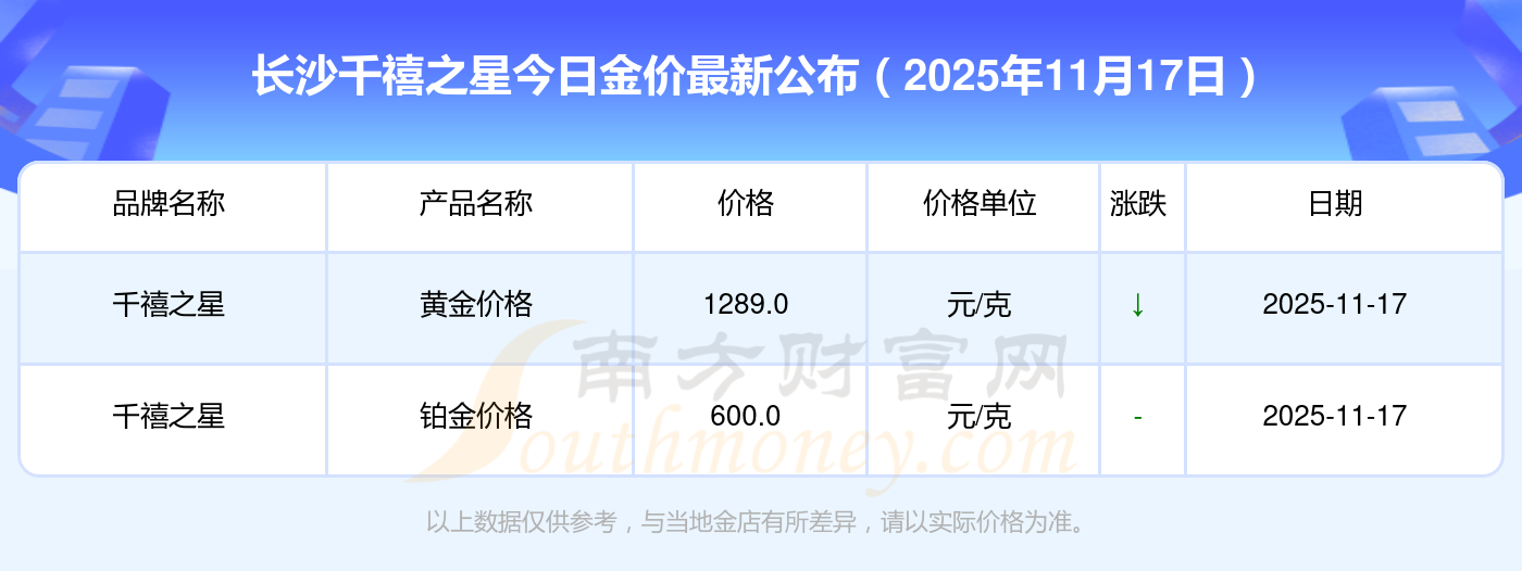 2025年11月17日长沙千禧之星一克黄金对应的价格是多少?金饰价格(内地)1305.0元/克,黄金饰品(香港)46270.0,铂金饰品(香港)13490.0,金条金价(香港)41990.0,投资金条1280.0元/克,工艺金条1295.0元/克,千足金首饰1285.0元/克,投资银条11.5元/克,黄金回购921.0元/克,白银回购10.7元/克,千足金饰品1256.0元/克。