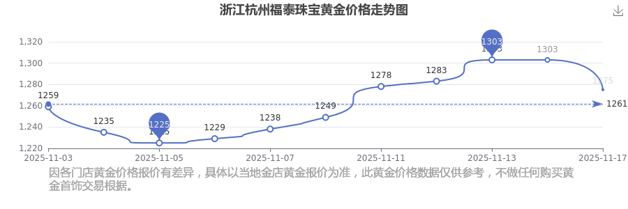 今日浙江杭州福泰珠宝黄金价格是1275.0元/克。