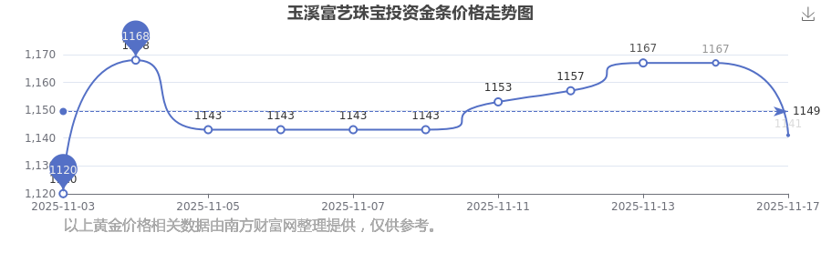 今日玉溪富艺珠宝投资金条价格:1141.0元/克。