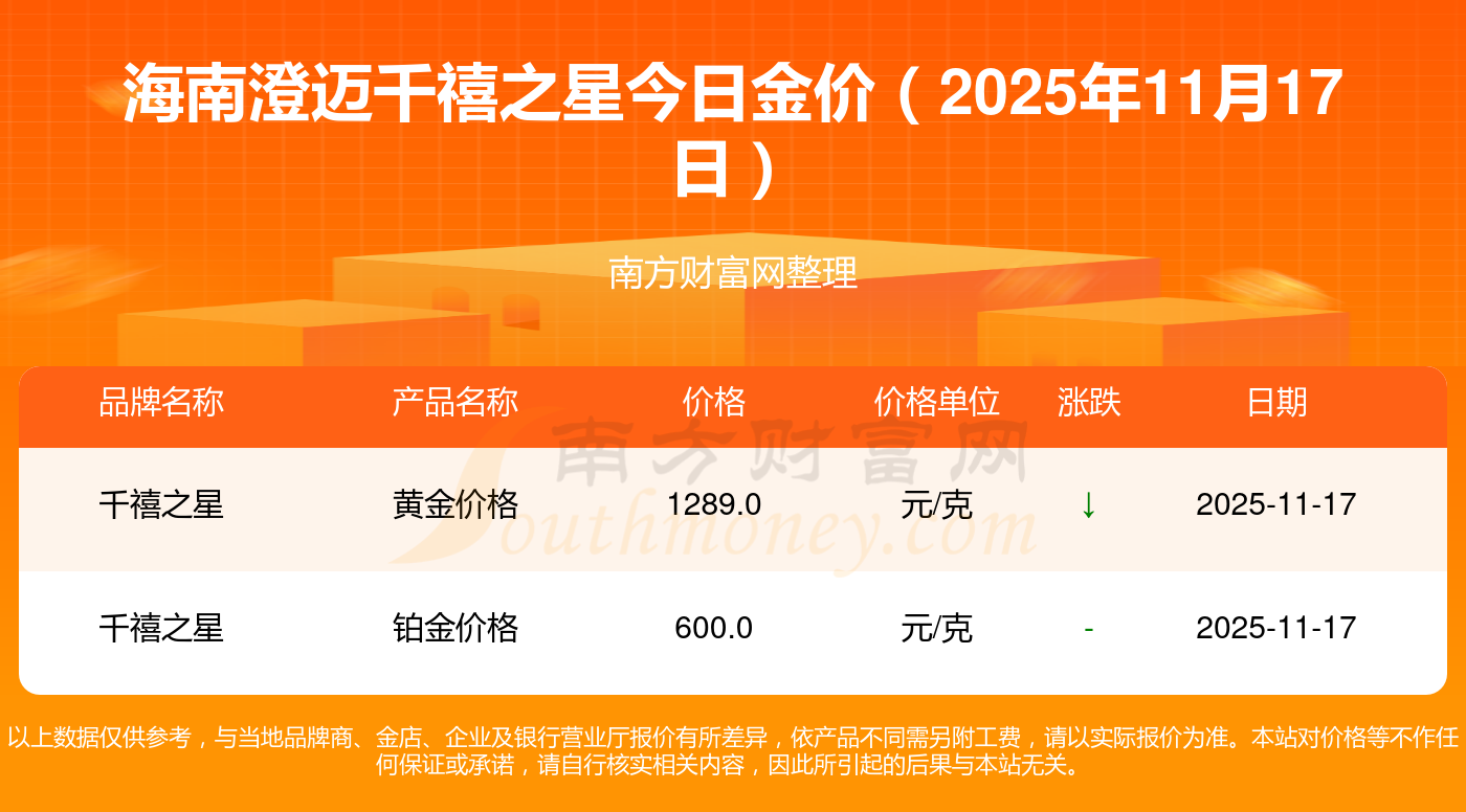 2025年11月17日海南澄迈千禧之星一克黄金对应的价格是多少?金饰价格(内地)1305.0元/克,黄金饰品(香港)46270.0,铂金饰品(香港)13490.0,金条金价(香港)41990.0,投资金条1280.0元/克,工艺金条1295.0元/克,千足金首饰1285.0元/克,投资银条11.5元/克,黄金回购921.0元/克,白银回购10.7元/克,千足金饰品1256.0元/克。