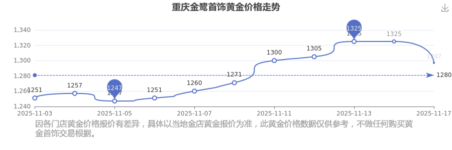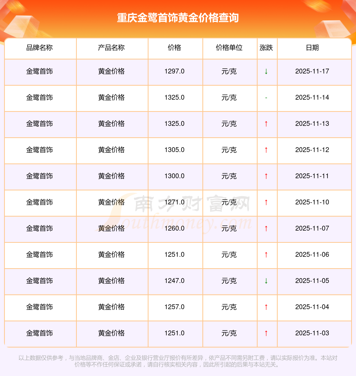 2025年11月17日重庆金鹭首饰黄金价格为1297.0元/克。