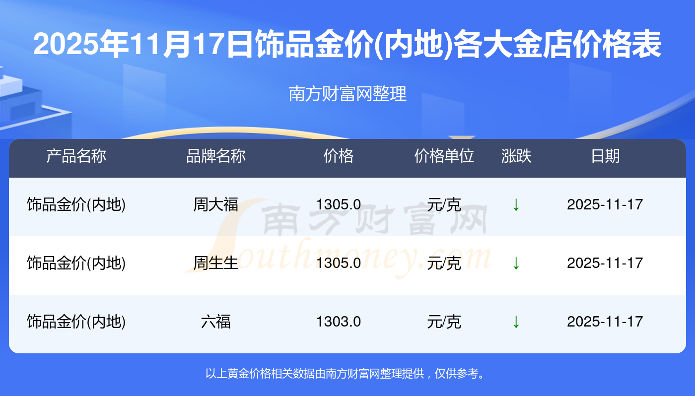 2025年11月17日,谢瑞麟、谢瑞麟、谢瑞麟、谢瑞麟、金银街、金银街、金银街、金银街、金银街、金银街、多边金都珠宝等各大金店品牌饰品金价(内地)今日价格如下:谢瑞麟1305.0元/克、谢瑞麟46270.0、谢瑞麟13490.0、谢瑞麟41990.0、金银街1280.0元/克、金银街1295.0元/克、金银街1285.0元/克、金银街11.5元/克、金银街921.0元/克、金银街10.7元/克、多边金都珠宝1256.0元/克。