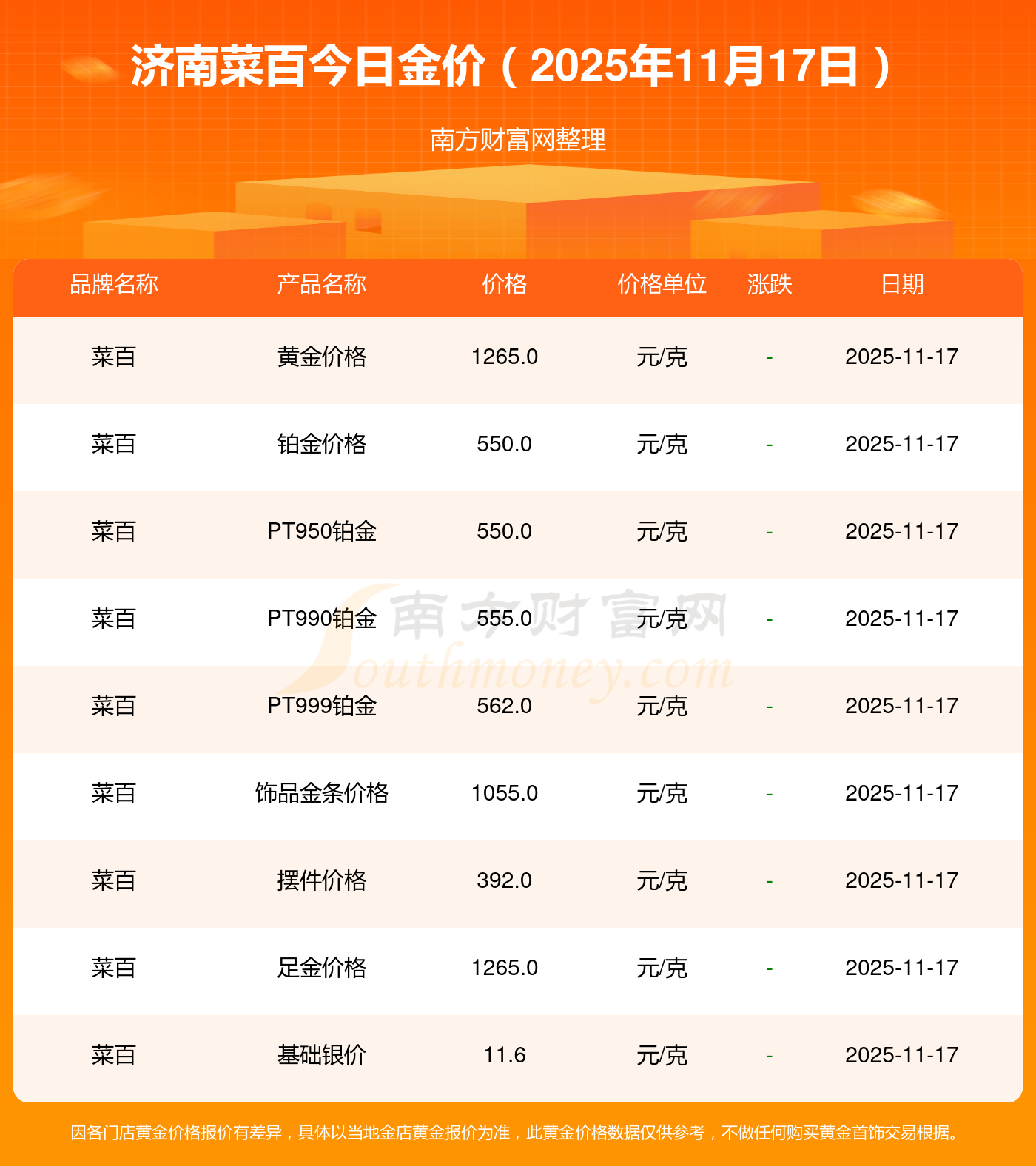 金饰价格(内地)1305.0元/克,黄金饰品(香港)46270.0,铂金饰品(香港)13490.0,金条金价(香港)41990.0,投资金条1280.0元/克,工艺金条1295.0元/克,千足金首饰1285.0元/克,投资银条11.5元/克,黄金回购921.0元/克,白银回购10.7元/克,千足金饰品1256.0元/克。