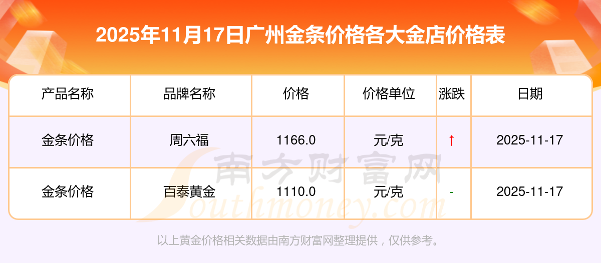 2025年11月17日广州各大金店金条价格最新价格:谢瑞麟1305.0元/克,谢瑞麟46270.0,谢瑞麟13490.0,谢瑞麟41990.0,金银街1280.0元/克,金银街1295.0元/克,金银街1285.0元/克,金银街11.5元/克,金银街921.0元/克,金银街10.7元/克,多边金都珠宝1256.0元/克。