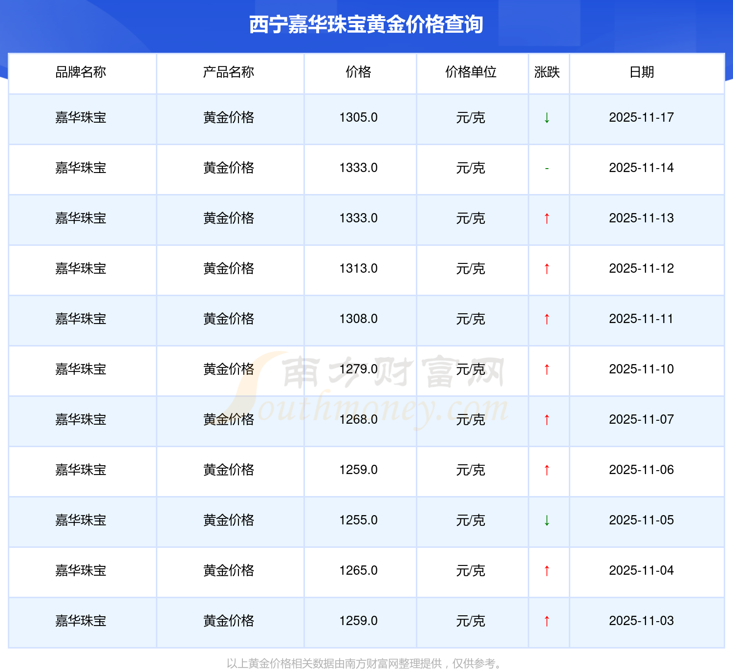 今日西宁嘉华珠宝黄金价格最新价格是1305.0元/克。