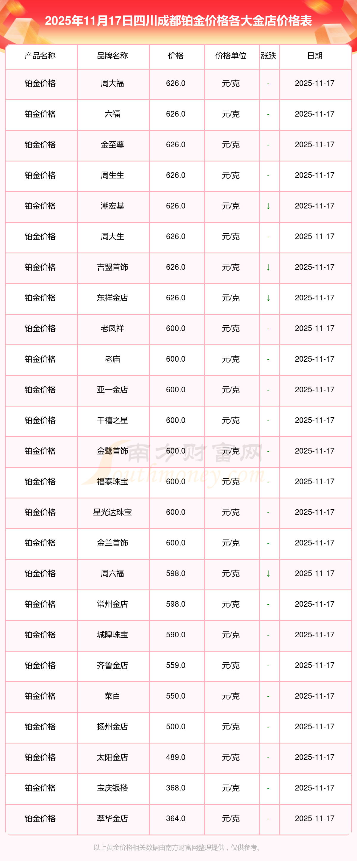 2025年11月17日,四川成都谢瑞麟、谢瑞麟、谢瑞麟、谢瑞麟、金银街、金银街、金银街、金银街、金银街、金银街、多边金都珠宝等各大金店品牌铂金价格今日价格如下:谢瑞麟1305.0元/克、谢瑞麟46270.0、谢瑞麟13490.0、谢瑞麟41990.0、金银街1280.0元/克、金银街1295.0元/克、金银街1285.0元/克、金银街11.5元/克、金银街921.0元/克、金银街10.7元/克、多边金都珠宝1256.0元/克。