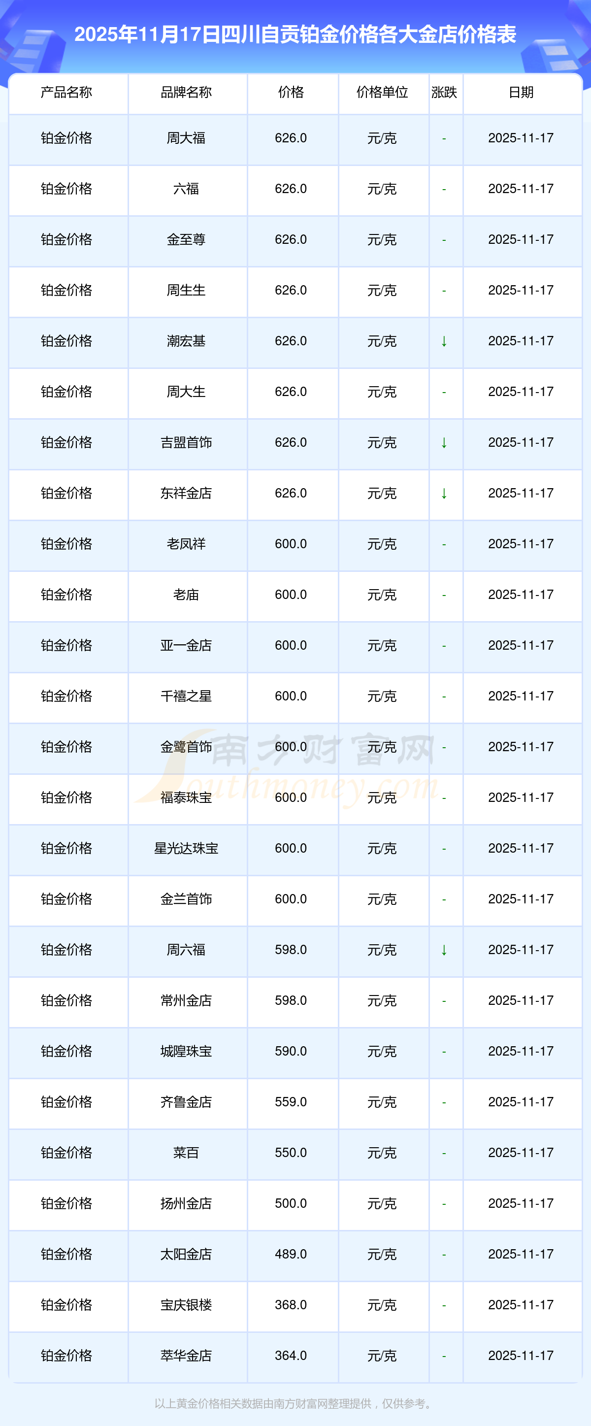2025年11月17日四川自贡谢瑞麟、谢瑞麟、谢瑞麟、谢瑞麟、金银街、金银街、金银街、金银街、金银街、金银街、多边金都珠宝等各大金店品牌铂金价格最新价格如下:谢瑞麟金饰价格(内地)1305.0元/克,谢瑞麟黄金饰品(香港)46270.0,谢瑞麟铂金饰品(香港)13490.0,谢瑞麟金条金价(香港)41990.0,金银街投资金条1280.0元/克,金银街工艺金条1295.0元/克,金银街千足金首饰1285.0元/克,金银街投资银条11.5元/克,金银街黄金回购921.0元/克,金银街白银回购10.7元/克,多边金都珠宝千足金饰品1256.0元/克。