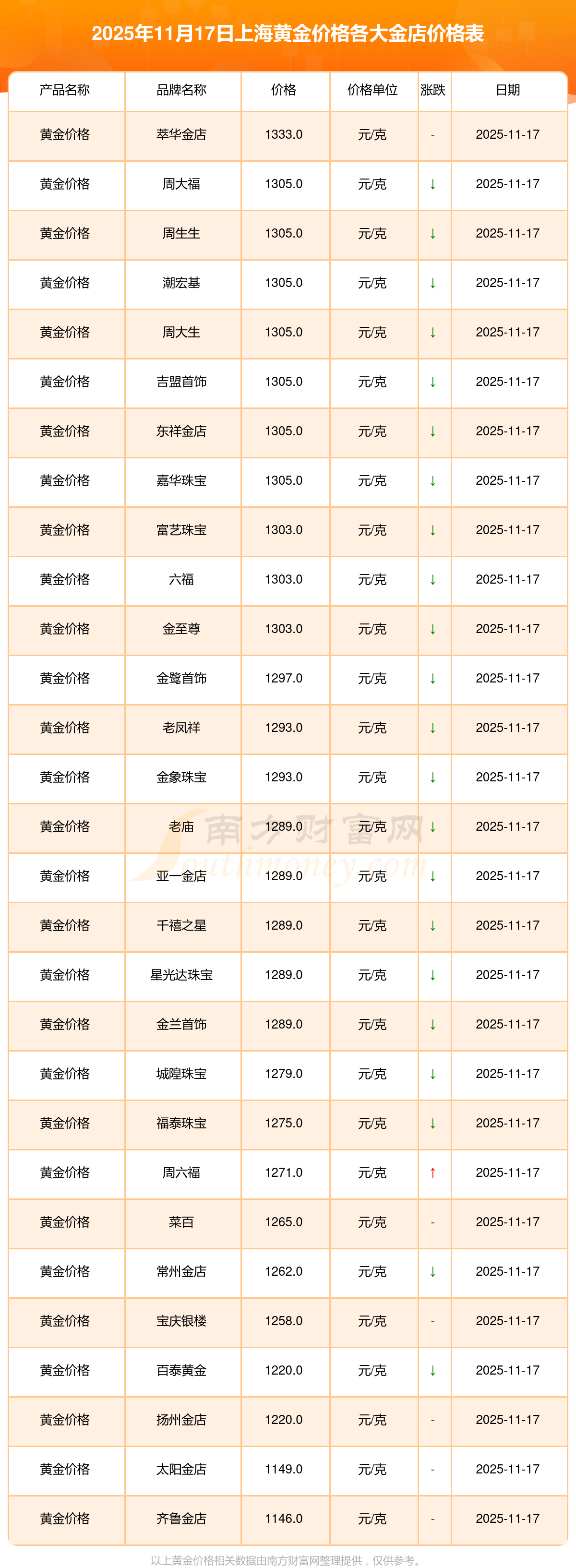 二、最新上海各金店黄金价格一览表,上海各金店黄金价格买一克得花多少钱?