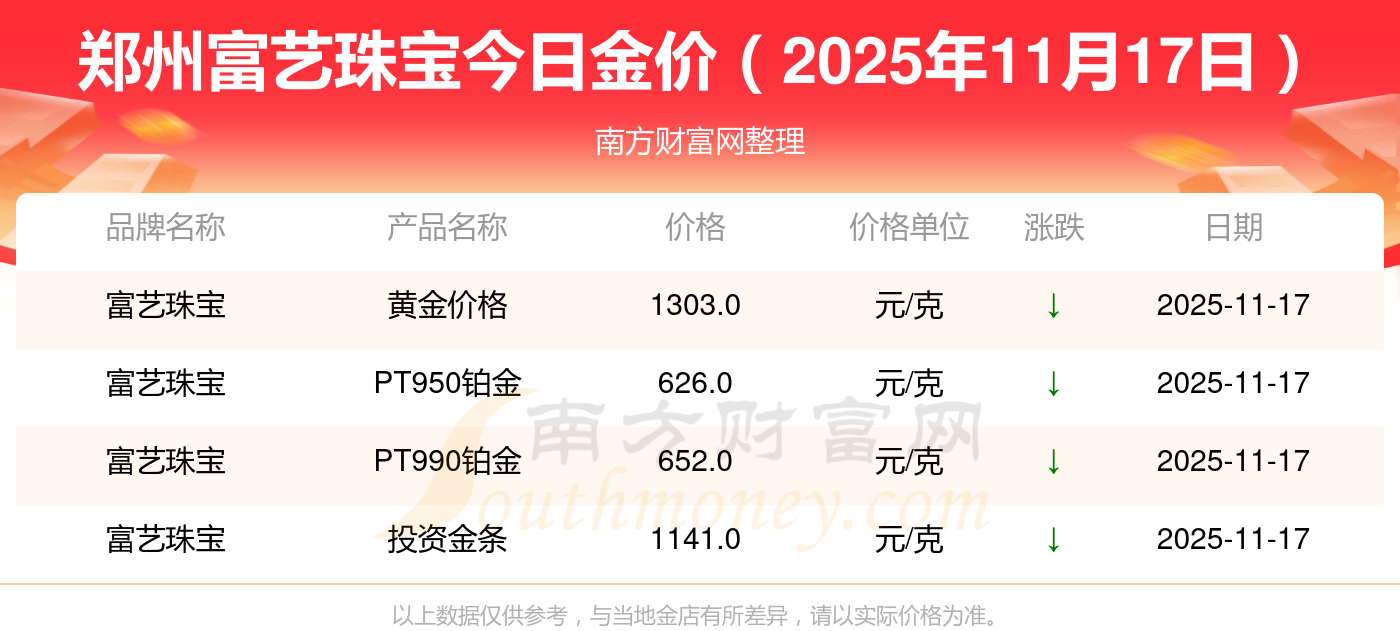 金饰价格(内地)1305.0元/克,黄金饰品(香港)46270.0,铂金饰品(香港)13490.0,金条金价(香港)41990.0,投资金条1280.0元/克,工艺金条1295.0元/克,千足金首饰1285.0元/克,投资银条11.5元/克,黄金回购921.0元/克,白银回购10.7元/克,千足金饰品1256.0元/克。