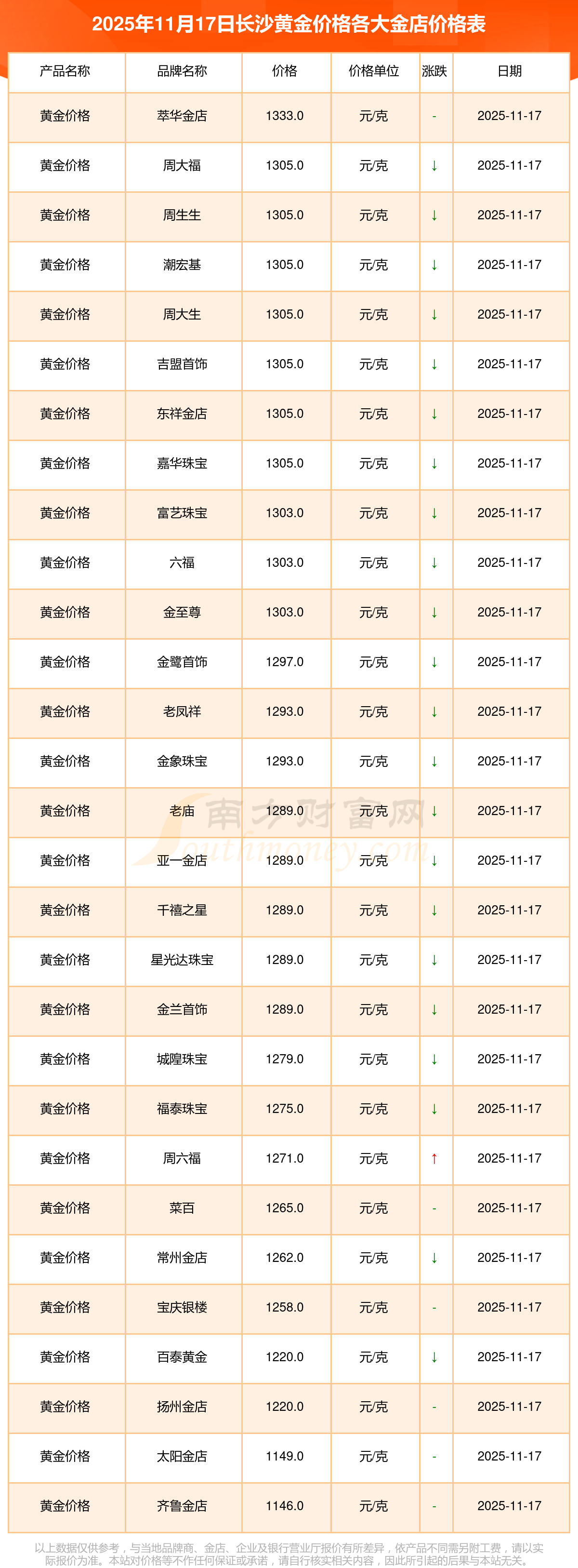 今天是2025年11月17日,长沙谢瑞麟、谢瑞麟、谢瑞麟、谢瑞麟、金银街、金银街、金银街、金银街、金银街、金银街、多边金都珠宝等各大金店品牌黄金价格最新价格如下:谢瑞麟1305.0元/克、谢瑞麟46270.0、谢瑞麟13490.0、谢瑞麟41990.0、金银街1280.0元/克、金银街1295.0元/克、金银街1285.0元/克、金银街11.5元/克、金银街921.0元/克、金银街10.7元/克、多边金都珠宝1256.0元/克。