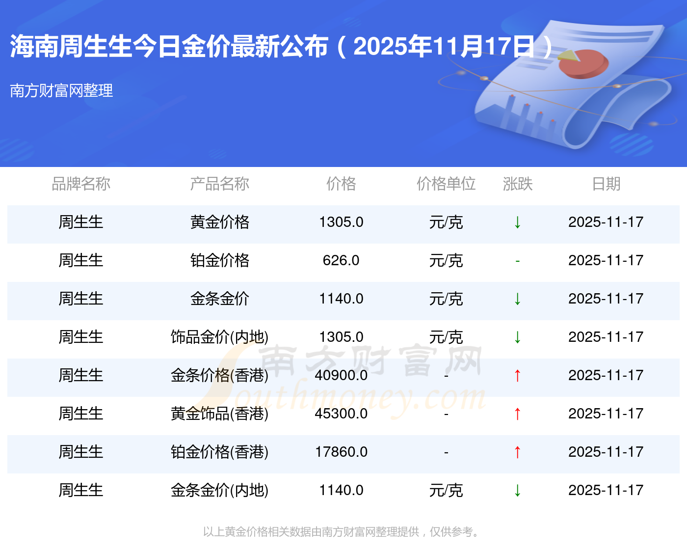金饰价格(内地)1305.0元/克,黄金饰品(香港)46270.0,铂金饰品(香港)13490.0,金条金价(香港)41990.0,投资金条1280.0元/克,工艺金条1295.0元/克,千足金首饰1285.0元/克,投资银条11.5元/克,黄金回购921.0元/克,白银回购10.7元/克,千足金饰品1256.0元/克。