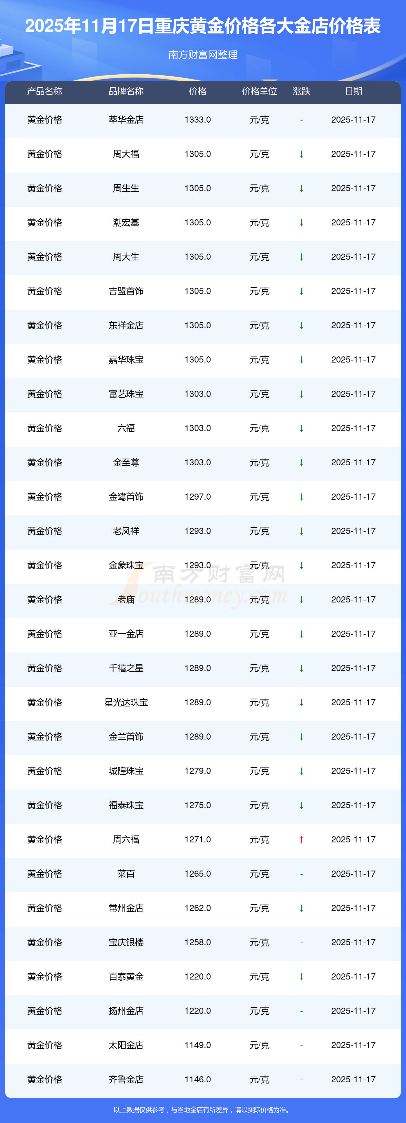 金饰在多家门店的售价是多少?2025年11月17日重庆各金店黄金价格表来了