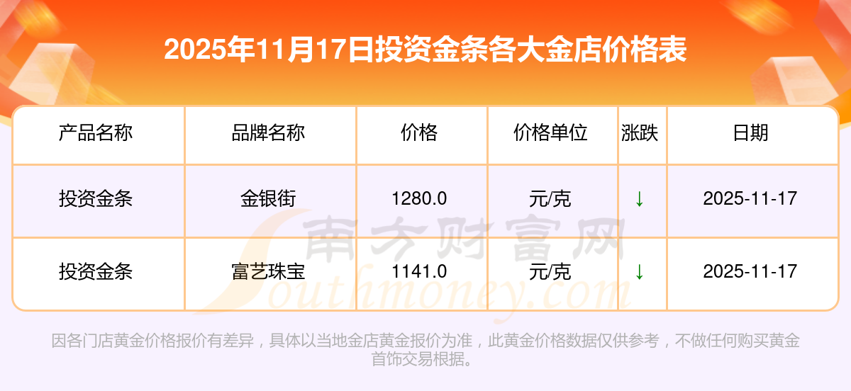 2025年11月17日,谢瑞麟、谢瑞麟、谢瑞麟、谢瑞麟、金银街、金银街、金银街、金银街、金银街、金银街、多边金都珠宝等各大金店品牌投资金条今日价格如下:谢瑞麟1305.0元/克、谢瑞麟46270.0、谢瑞麟13490.0、谢瑞麟41990.0、金银街1280.0元/克、金银街1295.0元/克、金银街1285.0元/克、金银街11.5元/克、金银街921.0元/克、金银街10.7元/克、多边金都珠宝1256.0元/克。