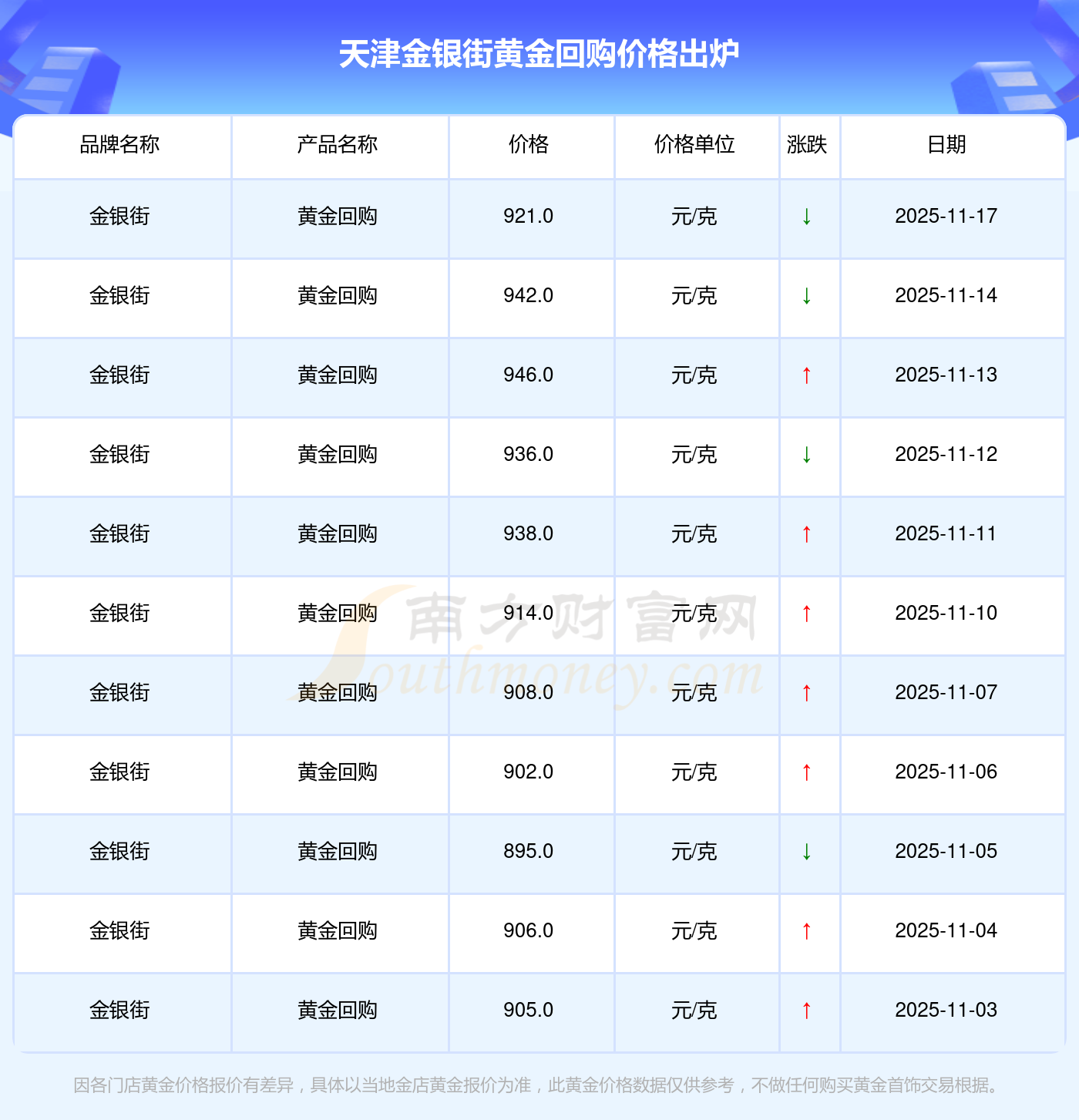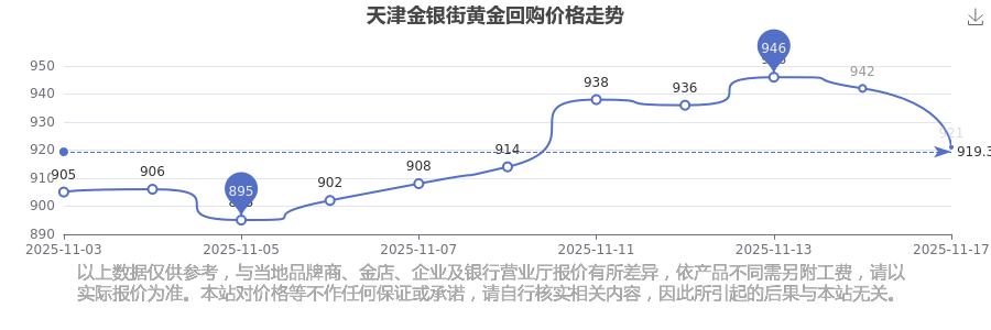 今日(2025年11月17日)天津金银街黄金回购价格:921.0元/克。