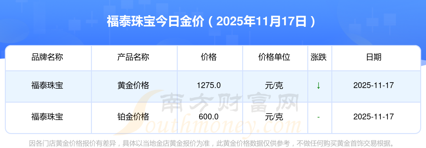 2025年11月17日各大金店铂金价格最新价格:谢瑞麟1305.0元/克,谢瑞麟46270.0,谢瑞麟13490.0,谢瑞麟41990.0,金银街1280.0元/克,金银街1295.0元/克,金银街1285.0元/克,金银街11.5元/克,金银街921.0元/克,金银街10.7元/克,多边金都珠宝1256.0元/克。