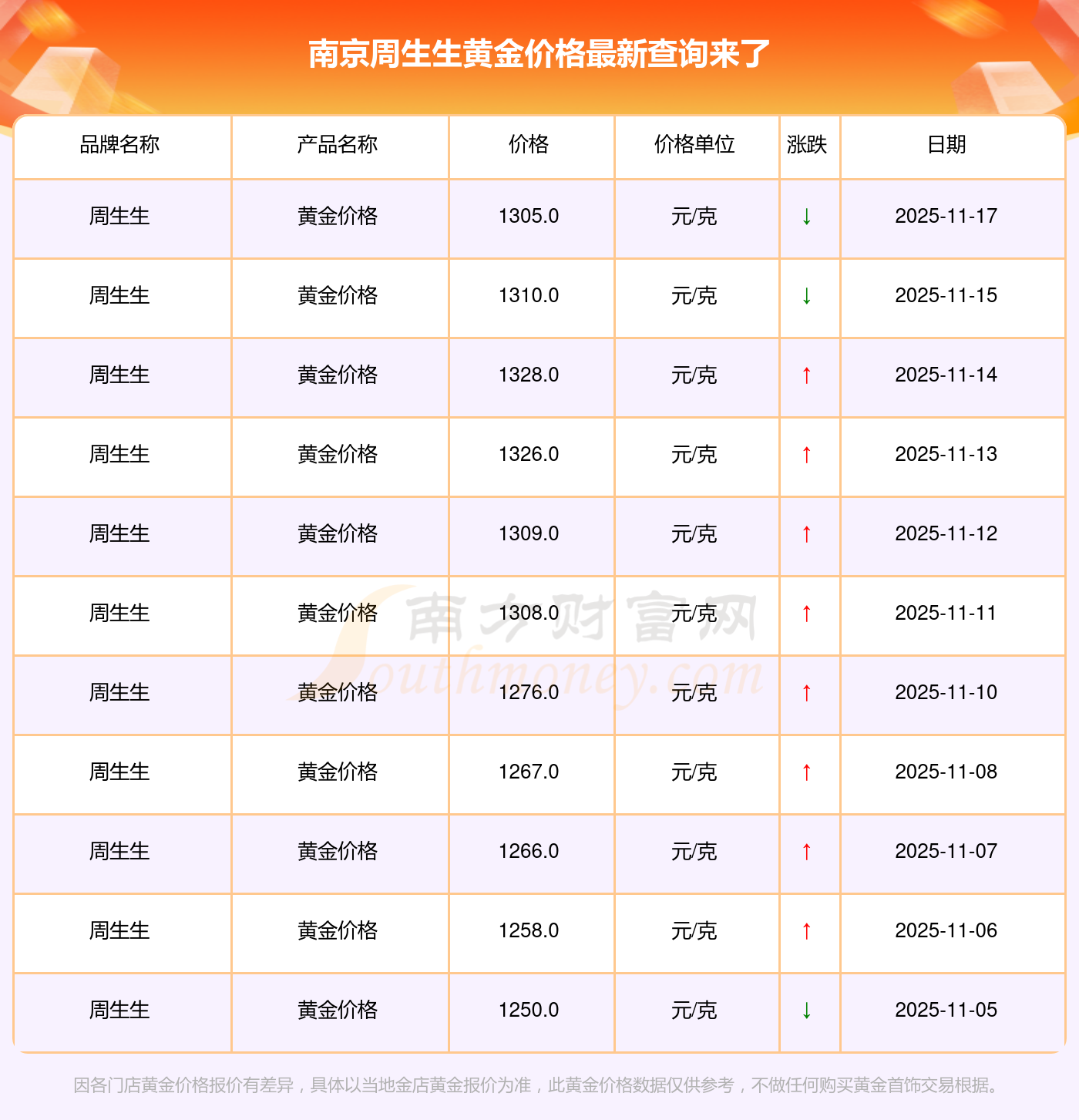 南京周生生 2025年11月17日的黄金价格价位为 1305.0元/克。