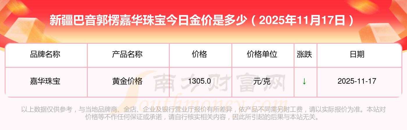 2025年11月17日新疆巴音郭楞嘉华珠宝黄金按克计价,现在多少钱一克?金饰价格(内地)1305.0元/克,黄金饰品(香港)46270.0,铂金饰品(香港)13490.0,金条金价(香港)41990.0,投资金条1280.0元/克,工艺金条1295.0元/克,千足金首饰1285.0元/克,投资银条11.5元/克,黄金回购921.0元/克,白银回购10.7元/克,千足金饰品1256.0元/克。