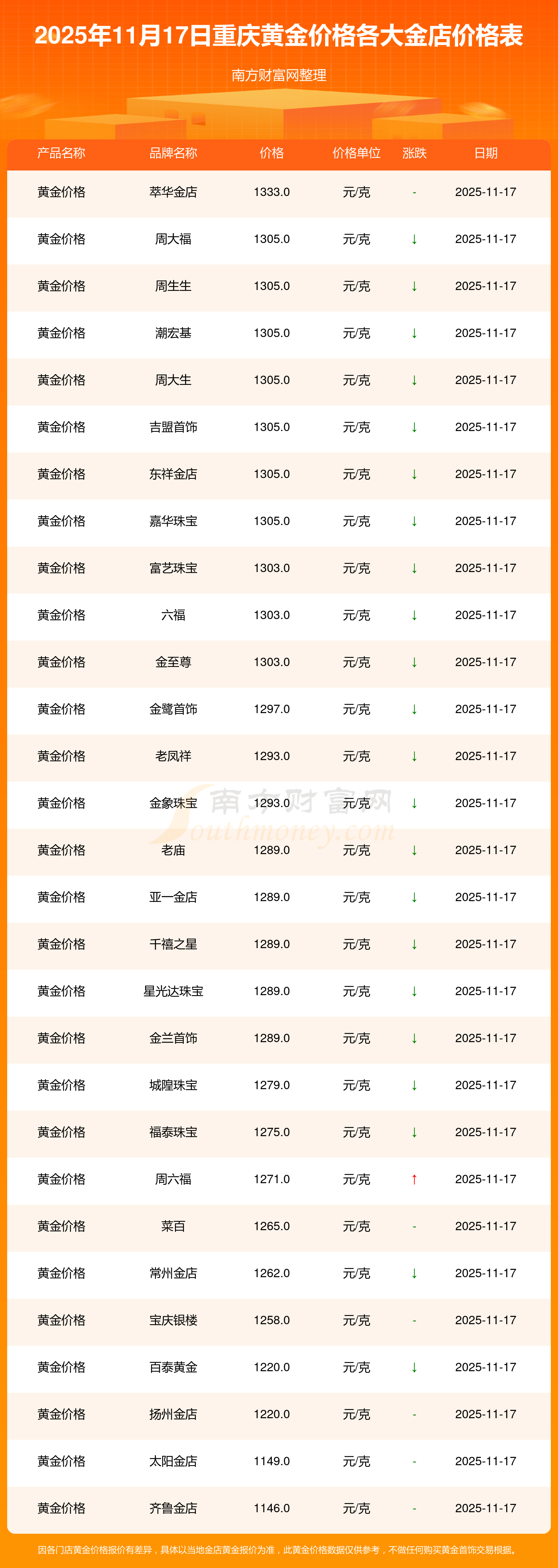 2025年11月17日,重庆谢瑞麟、谢瑞麟、谢瑞麟、谢瑞麟、金银街、金银街、金银街、金银街、金银街、金银街、多边金都珠宝等各大金店品牌黄金价格今日价格行情最新来了:谢瑞麟1305.0元/克、谢瑞麟46270.0、谢瑞麟13490.0、谢瑞麟41990.0、金银街1280.0元/克、金银街1295.0元/克、金银街1285.0元/克、金银街11.5元/克、金银街921.0元/克、金银街10.7元/克、多边金都珠宝1256.0元/克。