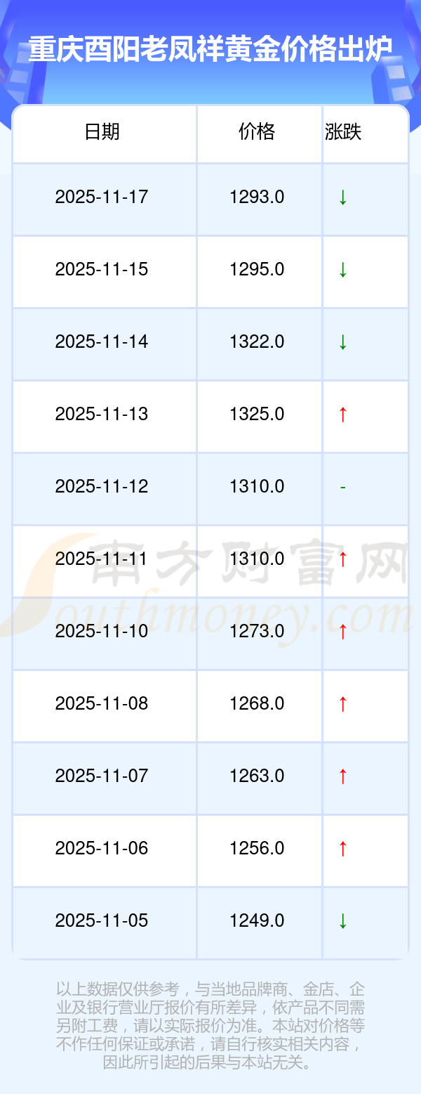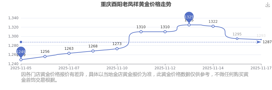 今日重庆酉阳老凤祥黄金价格查询,重庆酉阳老凤祥在 2025年11月17日,黄金价格的售卖价格是 1293.0元/克。