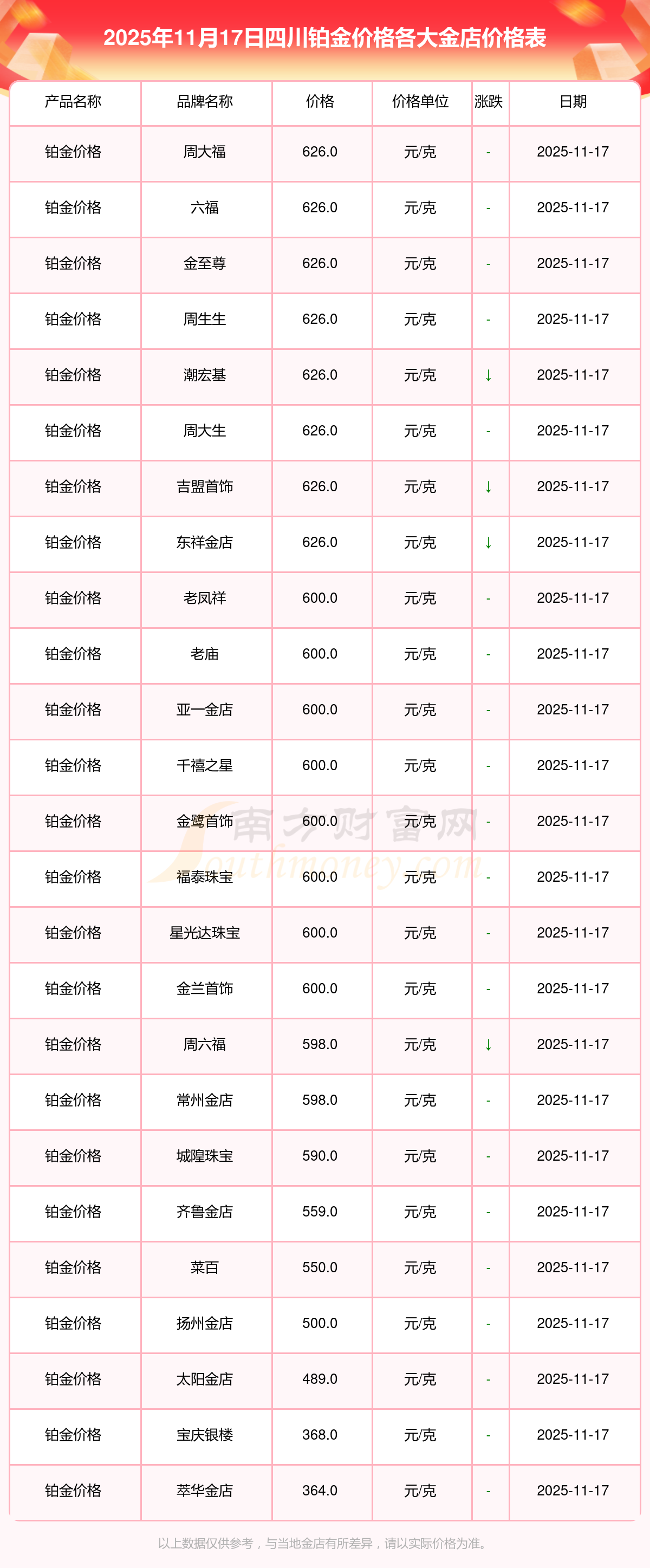 四川各大金店铂金价格表来了-2025年11月17日四川各大金店铂金价格多少钱一克?
