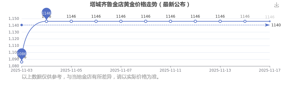 塔城齐鲁金店在 2025年11月17日的黄金价格零售价格为 1146.0元/克。