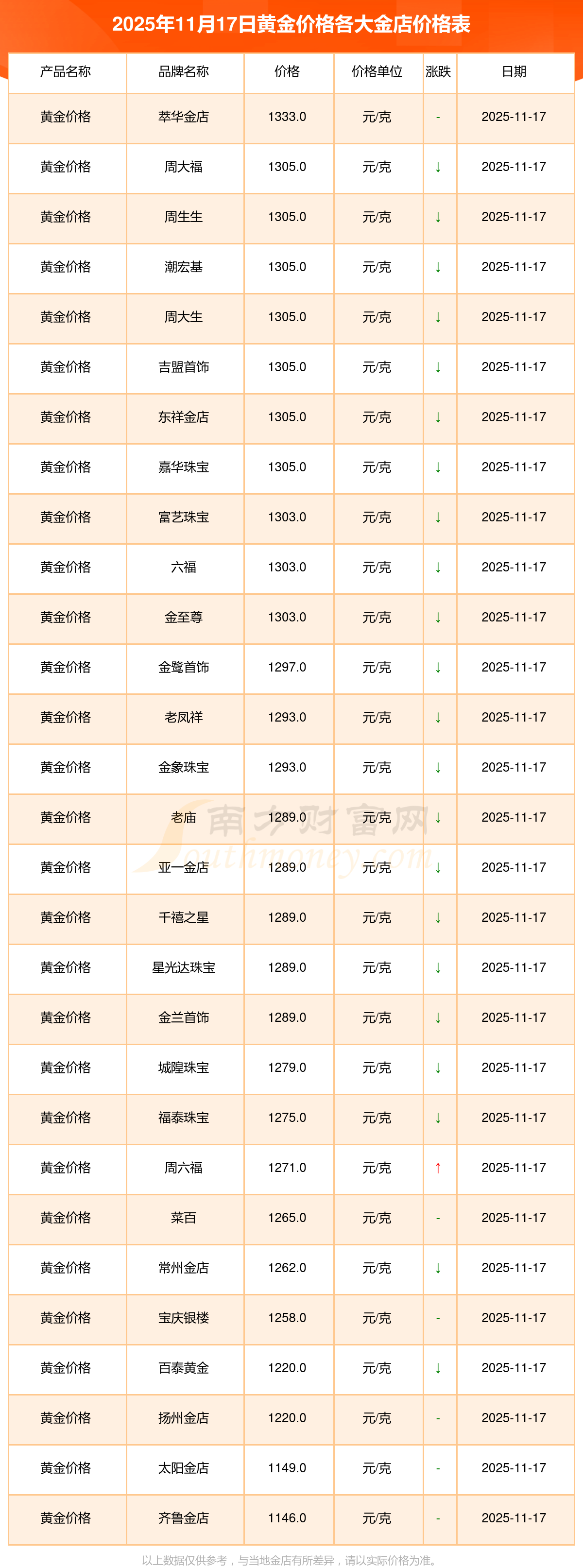 2025年11月17日谢瑞麟、谢瑞麟、谢瑞麟、谢瑞麟、金银街、金银街、金银街、金银街、金银街、金银街、多边金都珠宝等各大金店品牌黄金价格最新价格如下:谢瑞麟金饰价格(内地)1305.0元/克,谢瑞麟黄金饰品(香港)46270.0,谢瑞麟铂金饰品(香港)13490.0,谢瑞麟金条金价(香港)41990.0,金银街投资金条1280.0元/克,金银街工艺金条1295.0元/克,金银街千足金首饰1285.0元/克,金银街投资银条11.5元/克,金银街黄金回购921.0元/克,金银街白银回购10.7元/克,多边金都珠宝千足金饰品1256.0元/克。