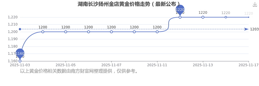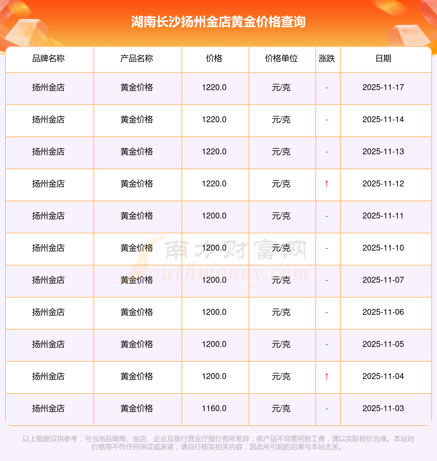 今日2025年11月17日,湖南长沙扬州金店黄金价格为1220.0元/克。