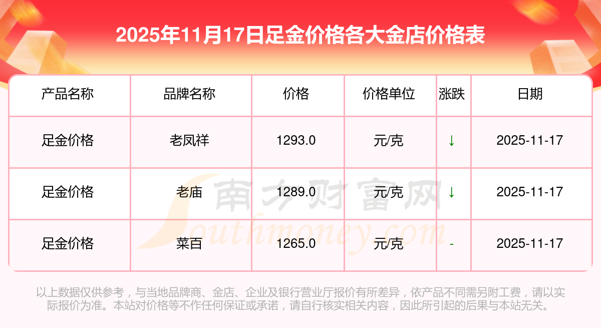 今天是2025年11月17日,谢瑞麟、谢瑞麟、谢瑞麟、谢瑞麟、金银街、金银街、金银街、金银街、金银街、金银街、多边金都珠宝等各大金店品牌足金价格最新价格如下:谢瑞麟1305.0元/克、谢瑞麟46270.0、谢瑞麟13490.0、谢瑞麟41990.0、金银街1280.0元/克、金银街1295.0元/克、金银街1285.0元/克、金银街11.5元/克、金银街921.0元/克、金银街10.7元/克、多边金都珠宝1256.0元/克。