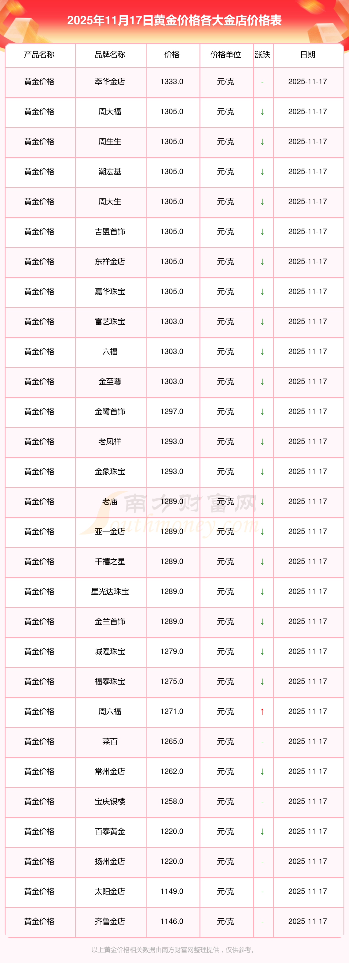 2025年11月17日各大金店黄金价格一克多少钱?各大金店黄金价格最新公布